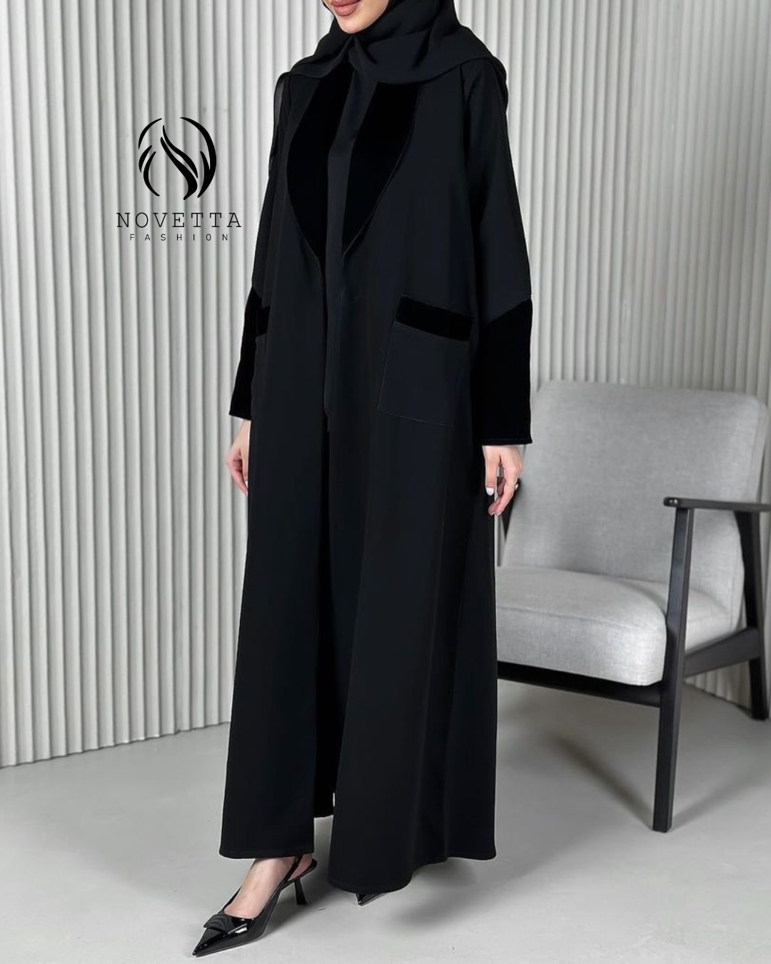 عباية فاخرة بتصميم أسود أنيق ولمسات مخملية راقية تعكس الفخامة الهادئة بأسلوب عصري بخامة بورتريكو كوري تقيلة وناعمة وسواد داكن مع مخمل سلك والمقاسات وافية واسعة