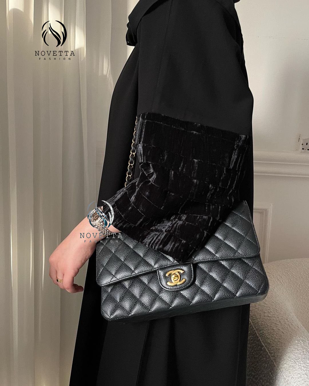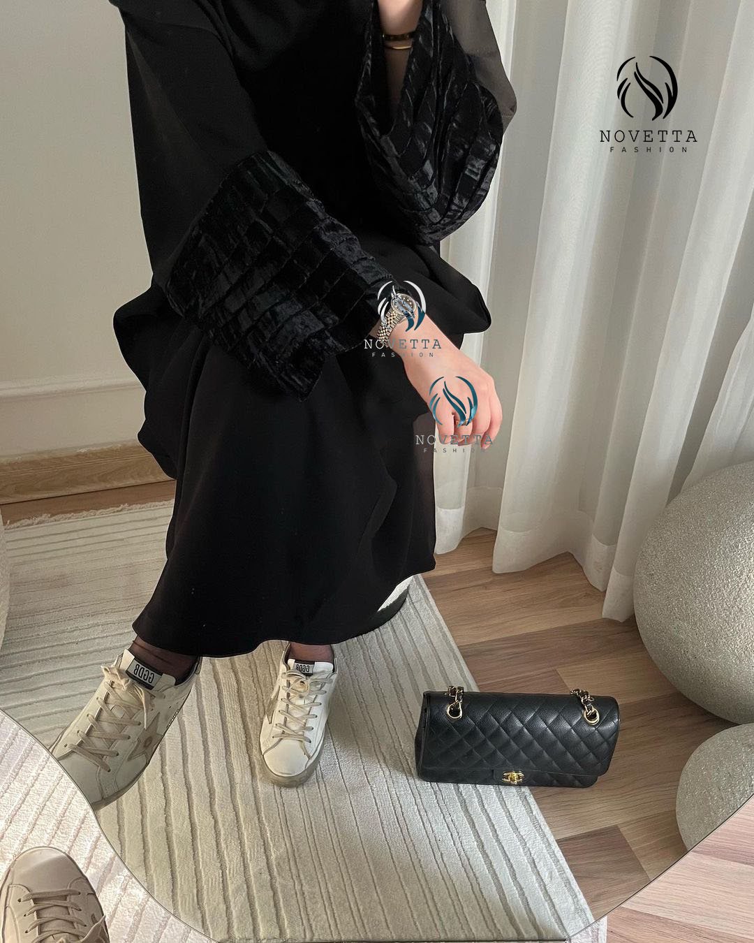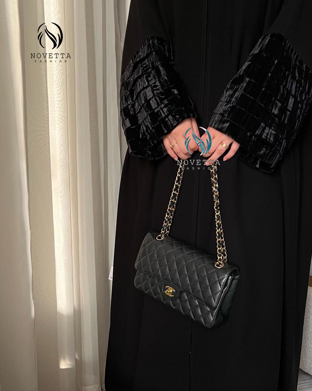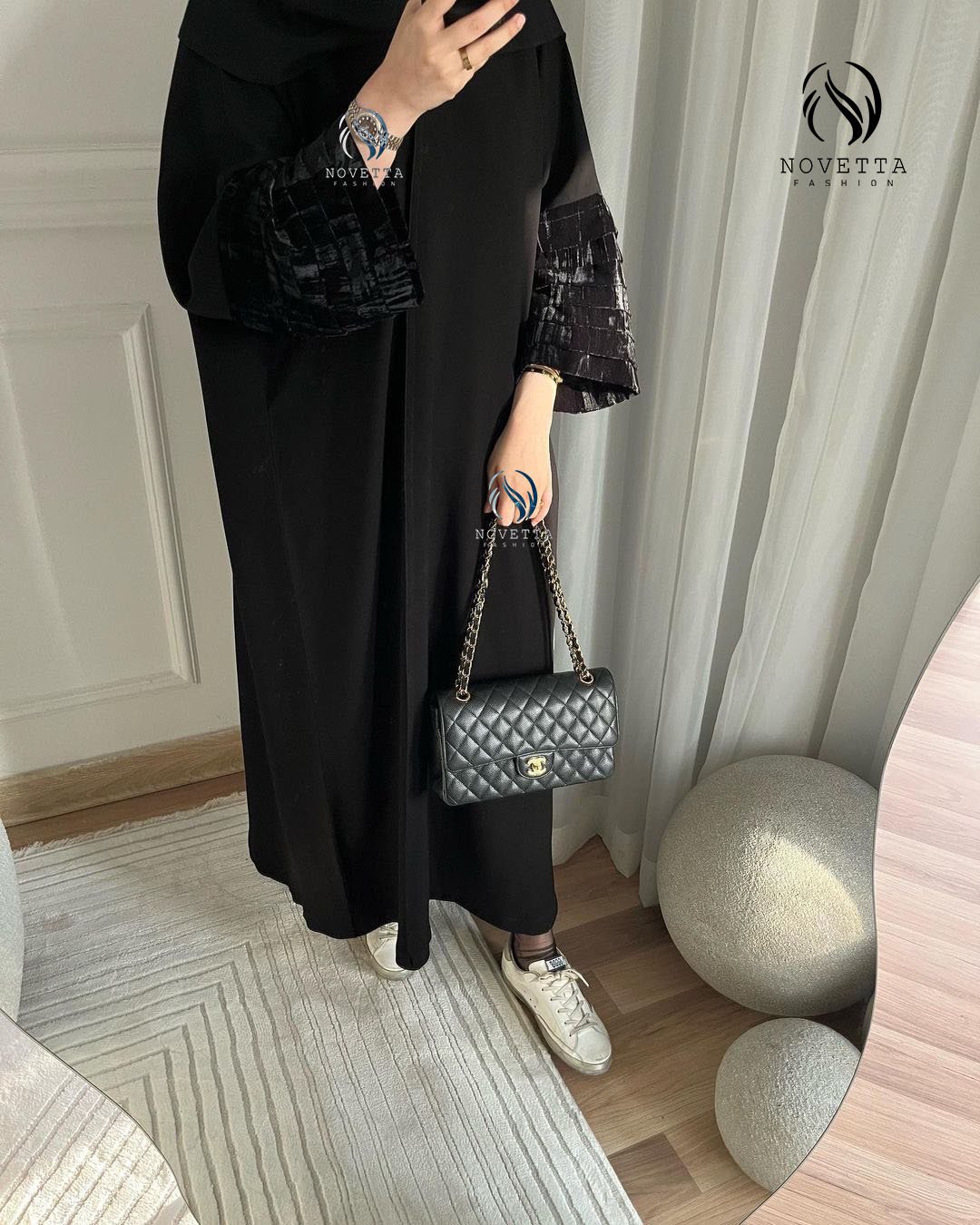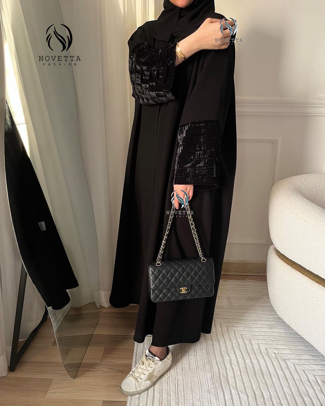 عباية خريفية أنيقة بتفاصيل كمّات مخملية فريدة تضيف لمسة فخامة ودفء لكل إطلالة بخامة بورتريكو كوري تقيلة وسوادها داكن ربيعية والكم مخمل سلك اسود داكن تقيل