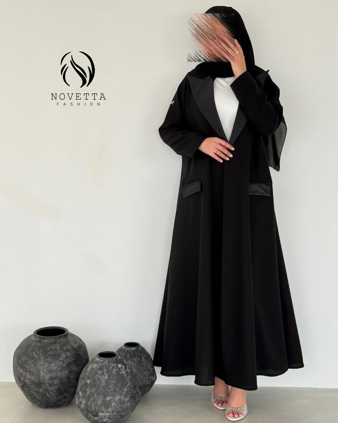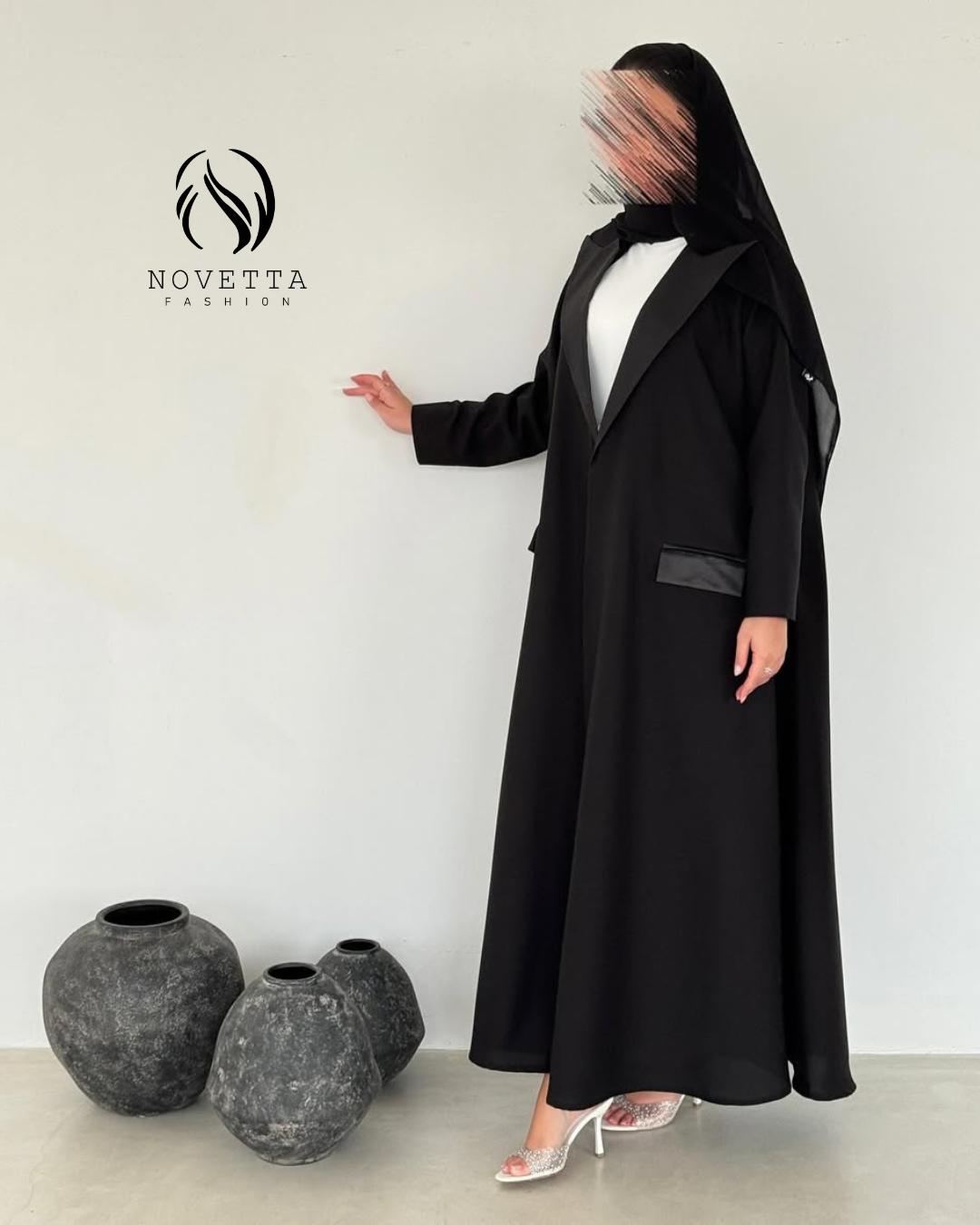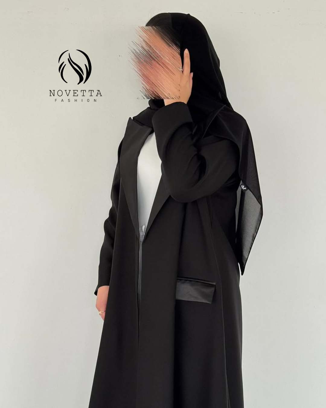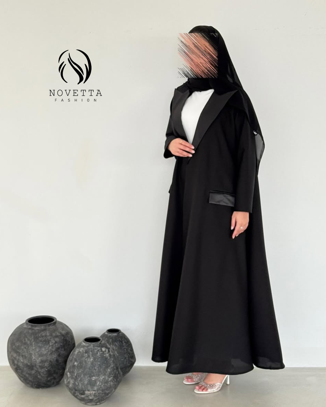 عباية تجسّد الرفعة والهيبة، بقصّة بليزر أنيقة ولمسات جلدية تضيف بريق فخامة خريفيّة كلاسيكية , بخامة كوبا بورتريكو كورية تقيلة وهدلة وناعمة وسواد داكن مع ستان زارا والمقاسات وافية واسعة