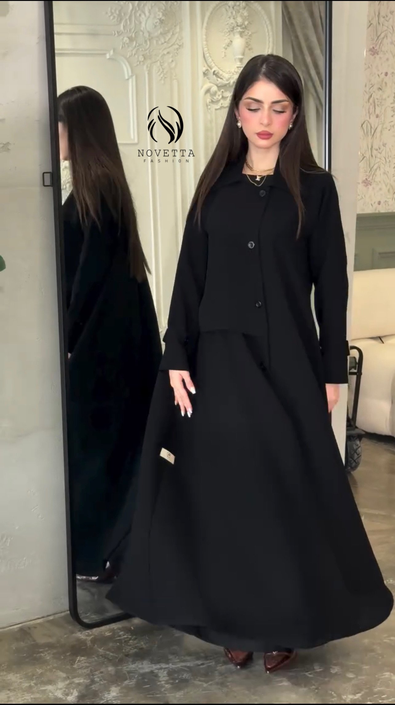 عباية فاخرة بتصميم انسيابي راقي، تجمع بين البساطة الراقية والقصّة العملية. خامة مريحة، وشكل مرتب يناسب الإطلالات الرسمية والجامعة والعمل. بخامة كريب كوري تقيلة وناعمة وهدلة وسواد داكن والمقاسات وافية واسعة