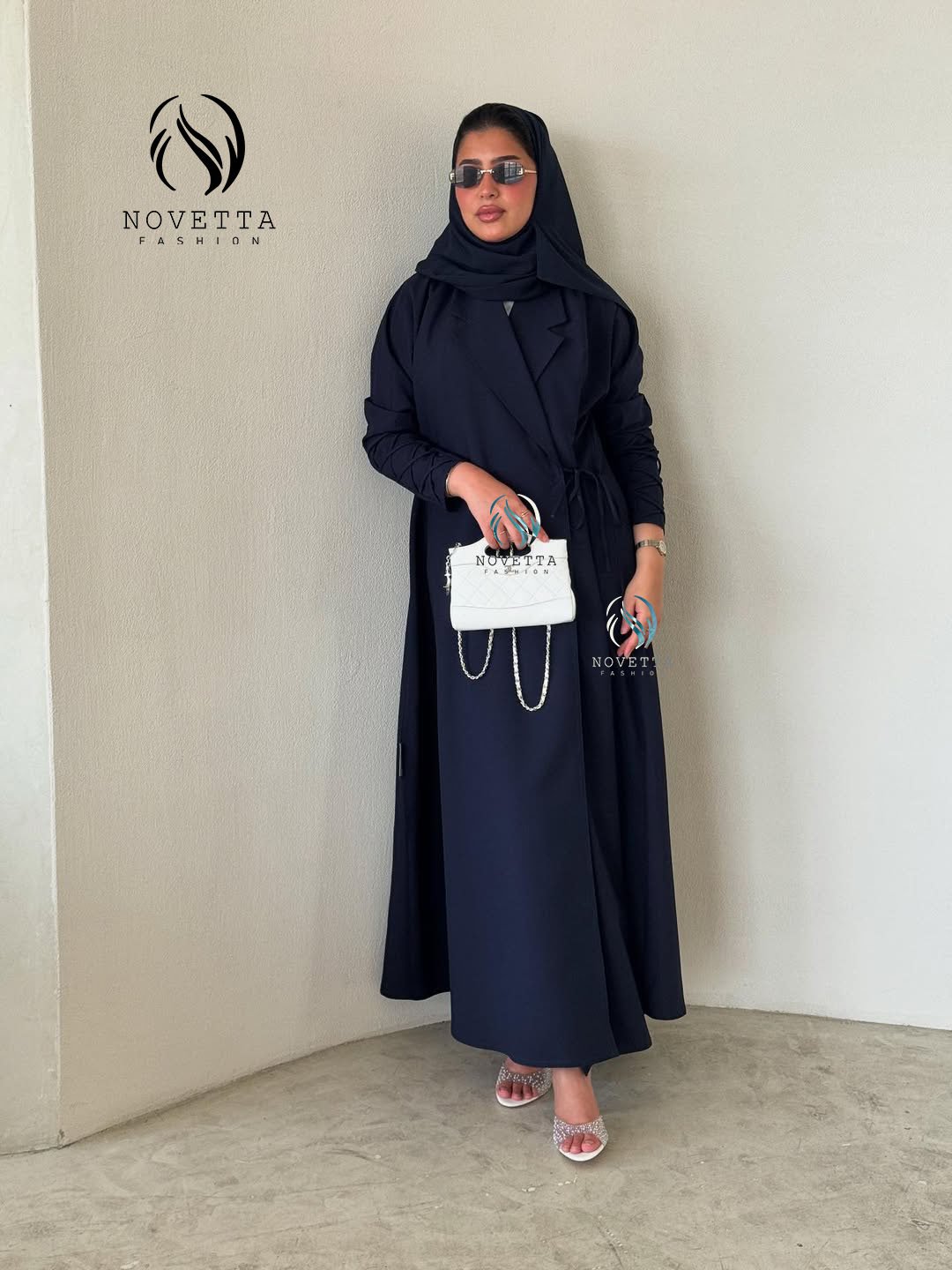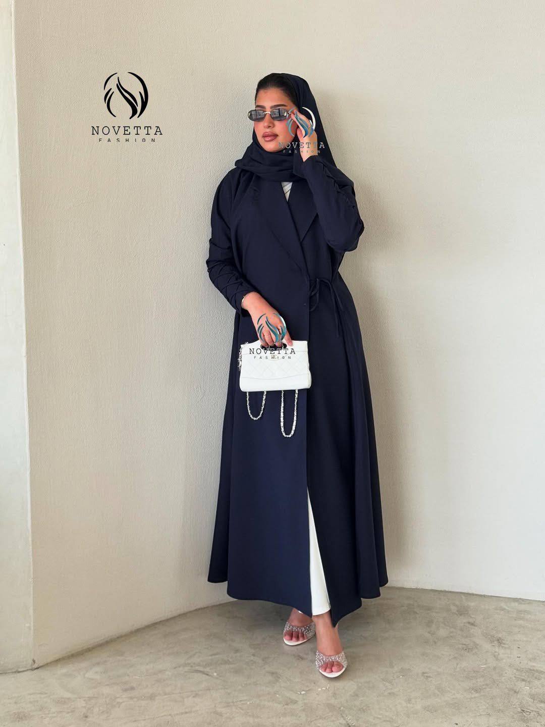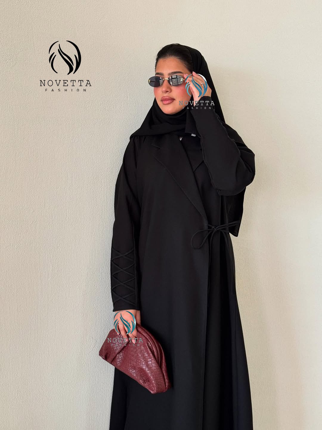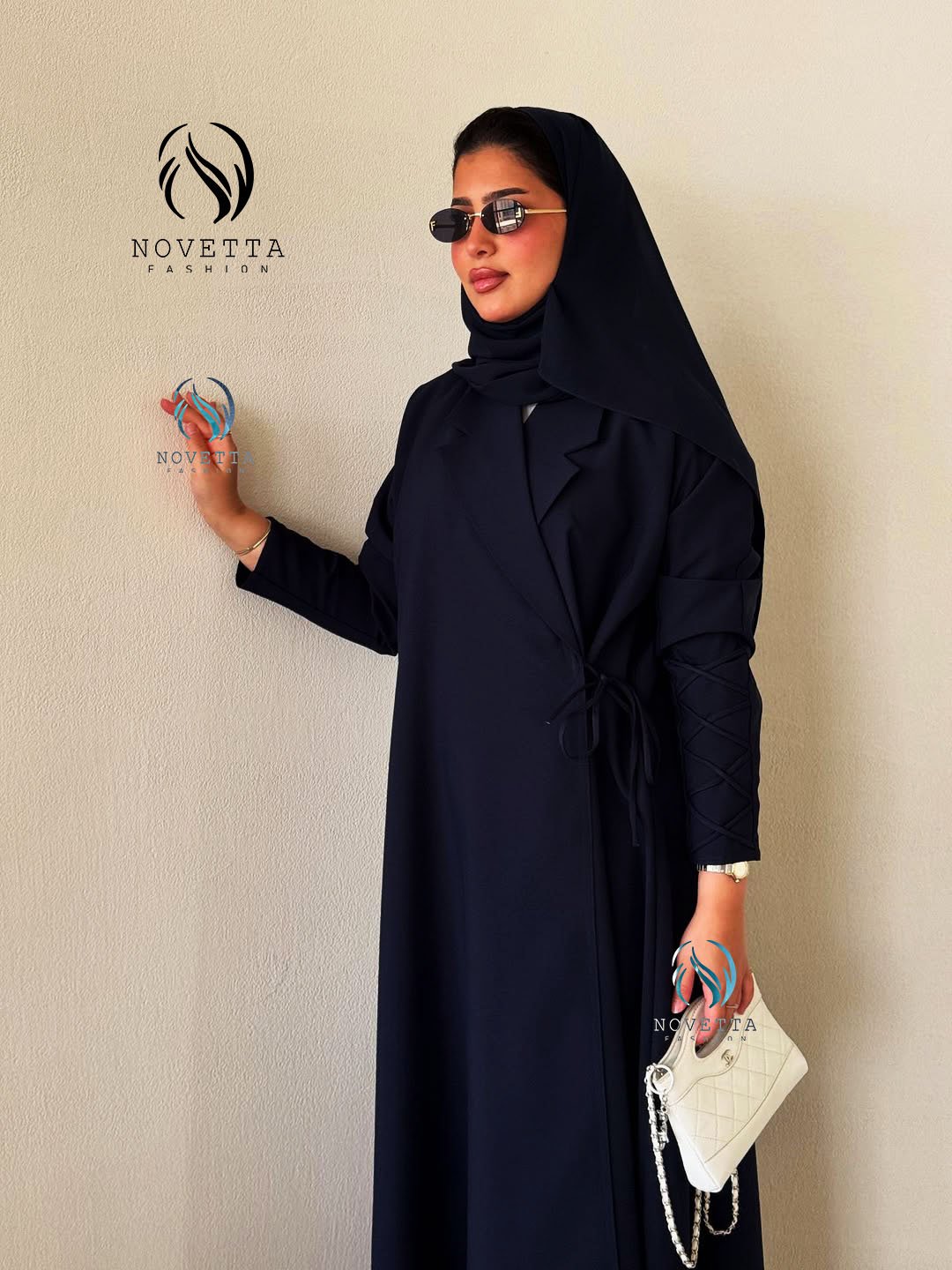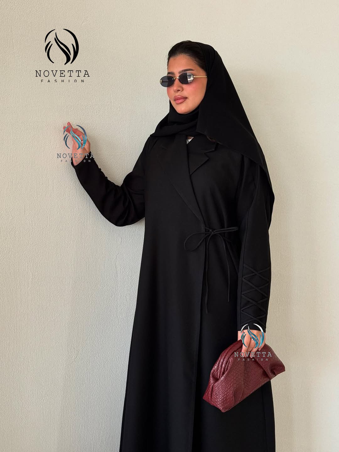 عباية فاخرة بقصة بليزر جذابة، مزينة بكسرات متقاطعة على الأكمام ولمسة ربط جانبية أنيقة بخامة بورتريكو كوري مرتبة عاللبس,المقاسات وافية و واسعة