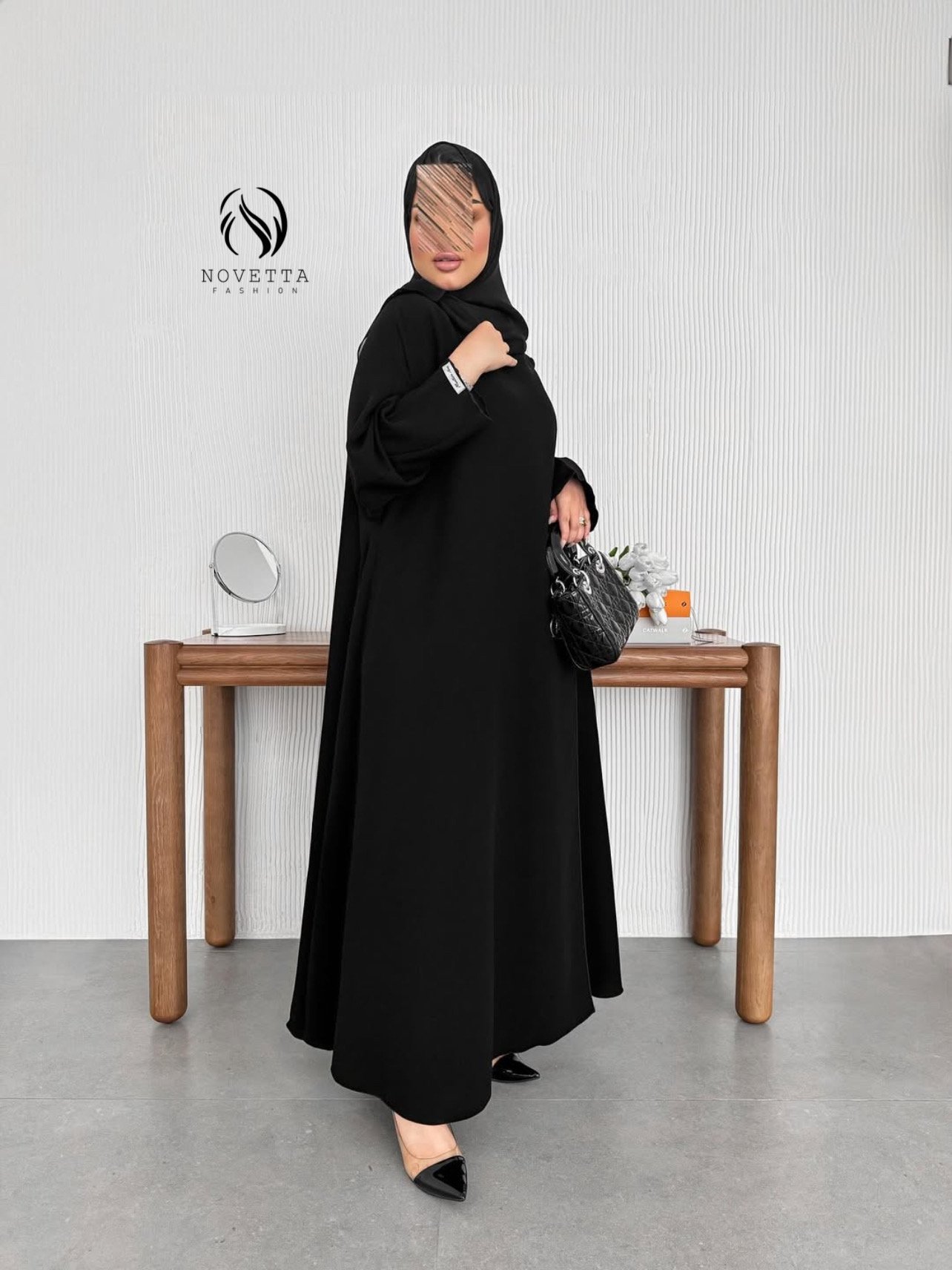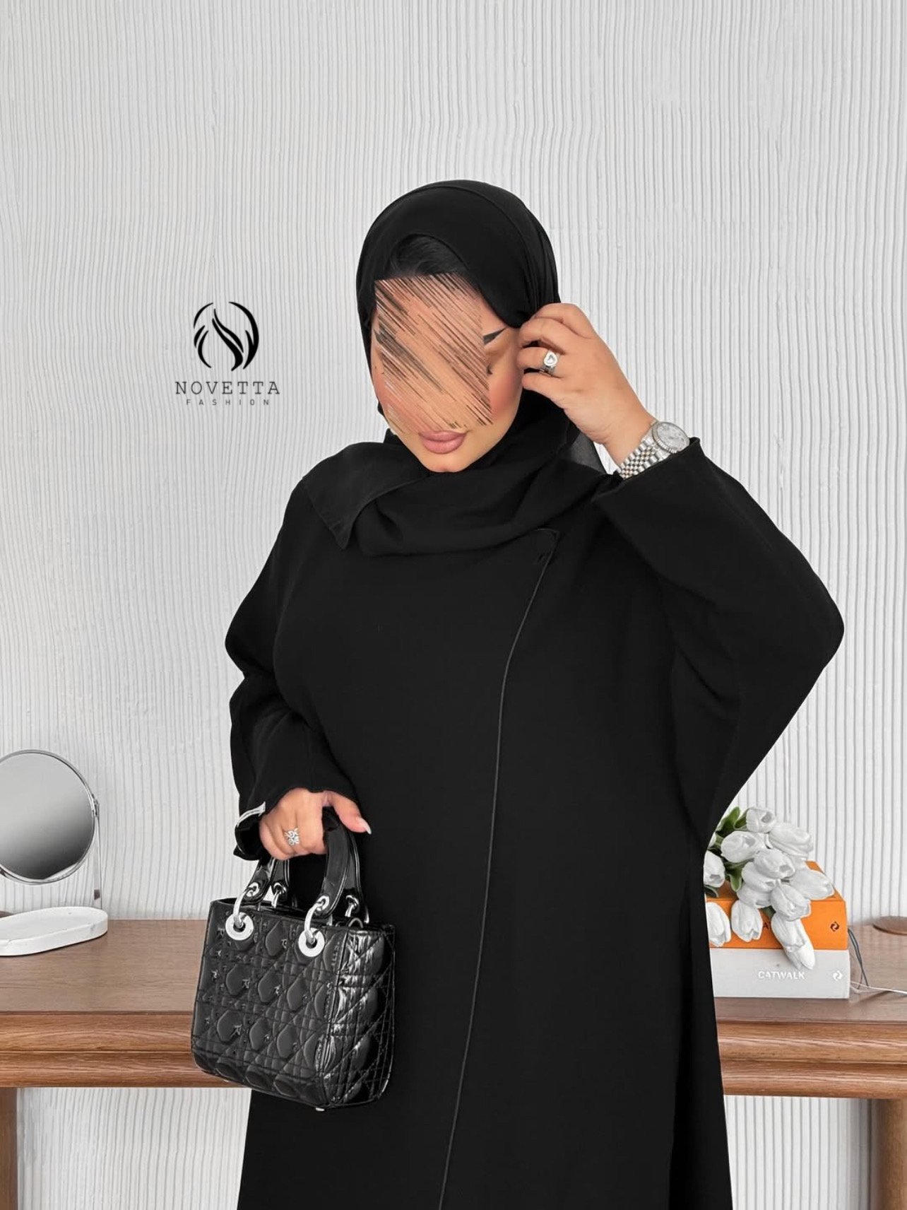 تصميم راقٍ بقَصّة انسيابية واسعة،يتفرّد بتسكيرة لفّ متقنة تنساب فيها الطبقات بتناغم أنيق.تفصيل يوازن بين الاحتشام والحداثة،ويمنح الإطلالة حضورًا هادئًا يعكس فخامة الذوق وبساطة الاختيار.