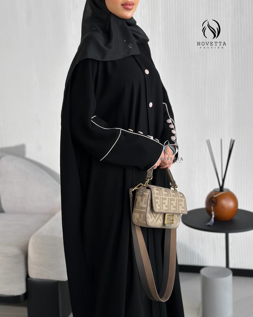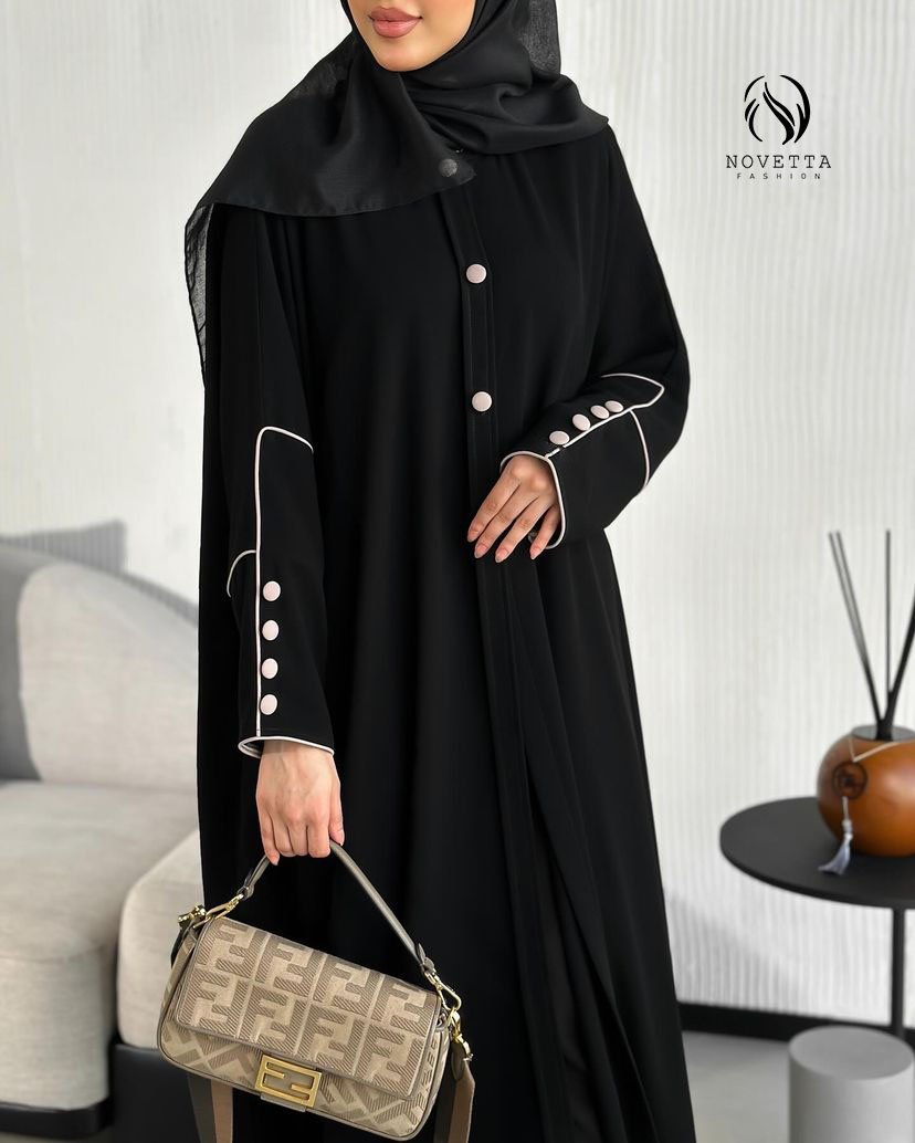 موديل يجسّد الأناقة الهادئة بكل تفاصيلها، عباية سوداء بتصميم انسيابي راقٍ ينسدل بنعومة ليمنحك حضورًا مهيبًا. تزيّنها أزرار بيج أنيقة تضيف تباينًا فاخرًا ولمسة دافئة تعكس الذوق الرفيع.