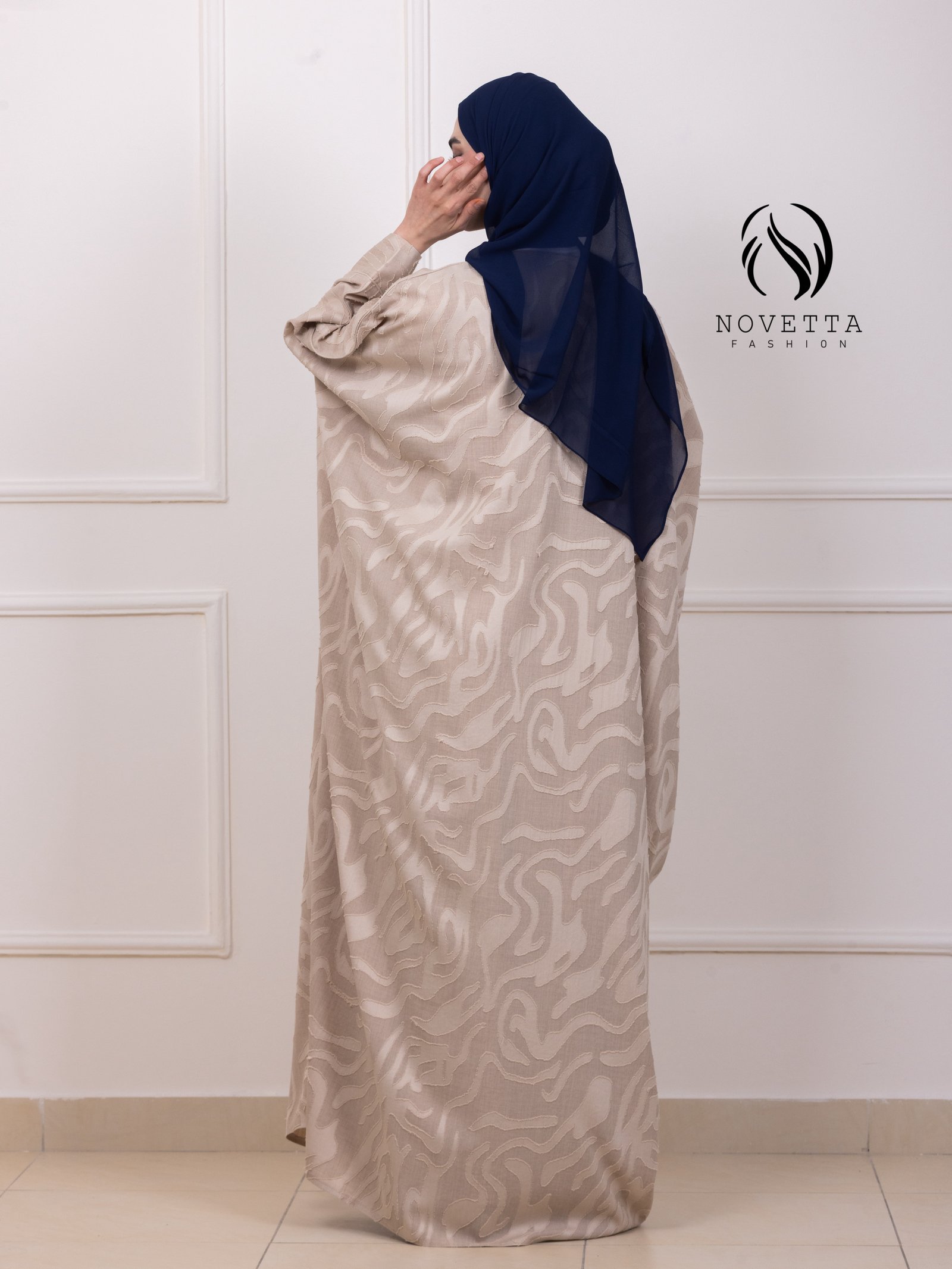بشت بانسياب راقٍ ينسدل بهدوء ملكي، مصاغ بقصّة واسعة تمنحك حضورًا آسرًا وخطوة واثقة بخامة ملنج جكار