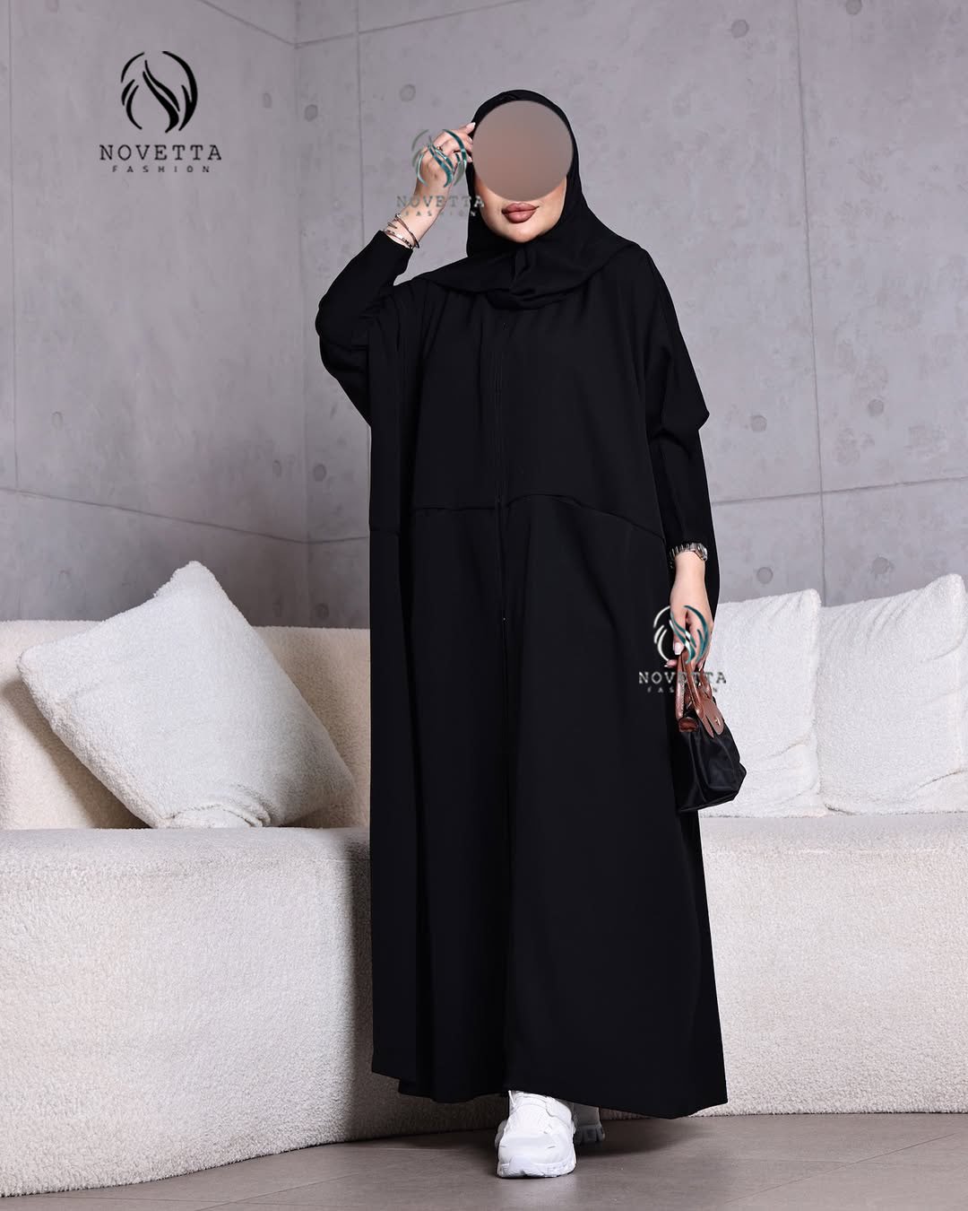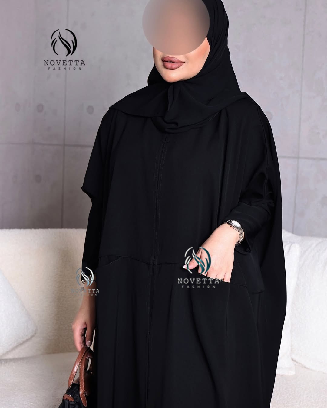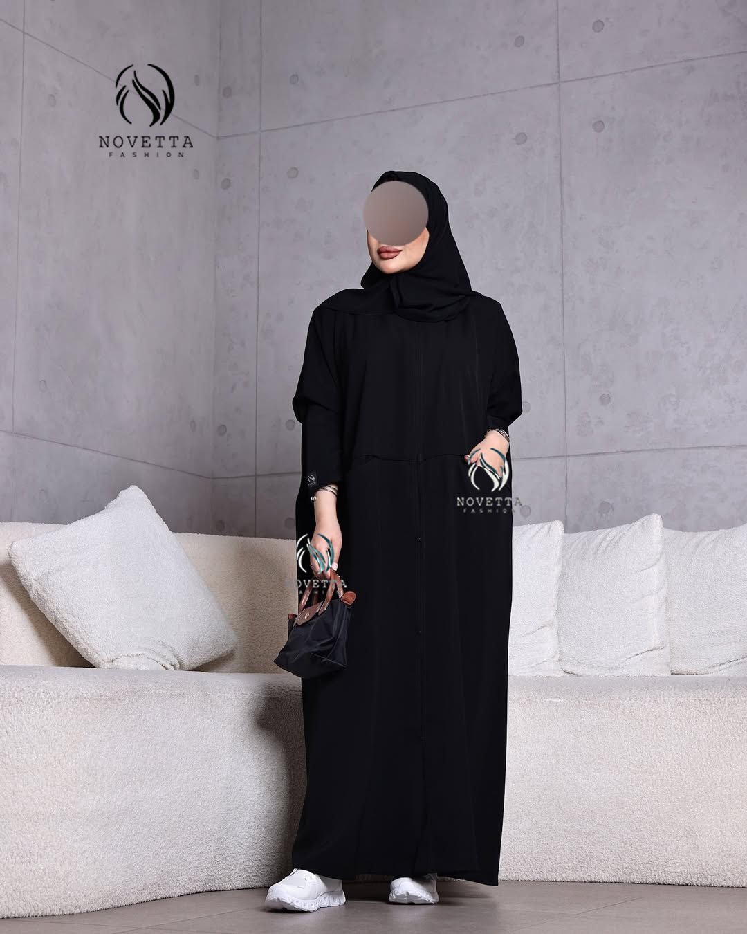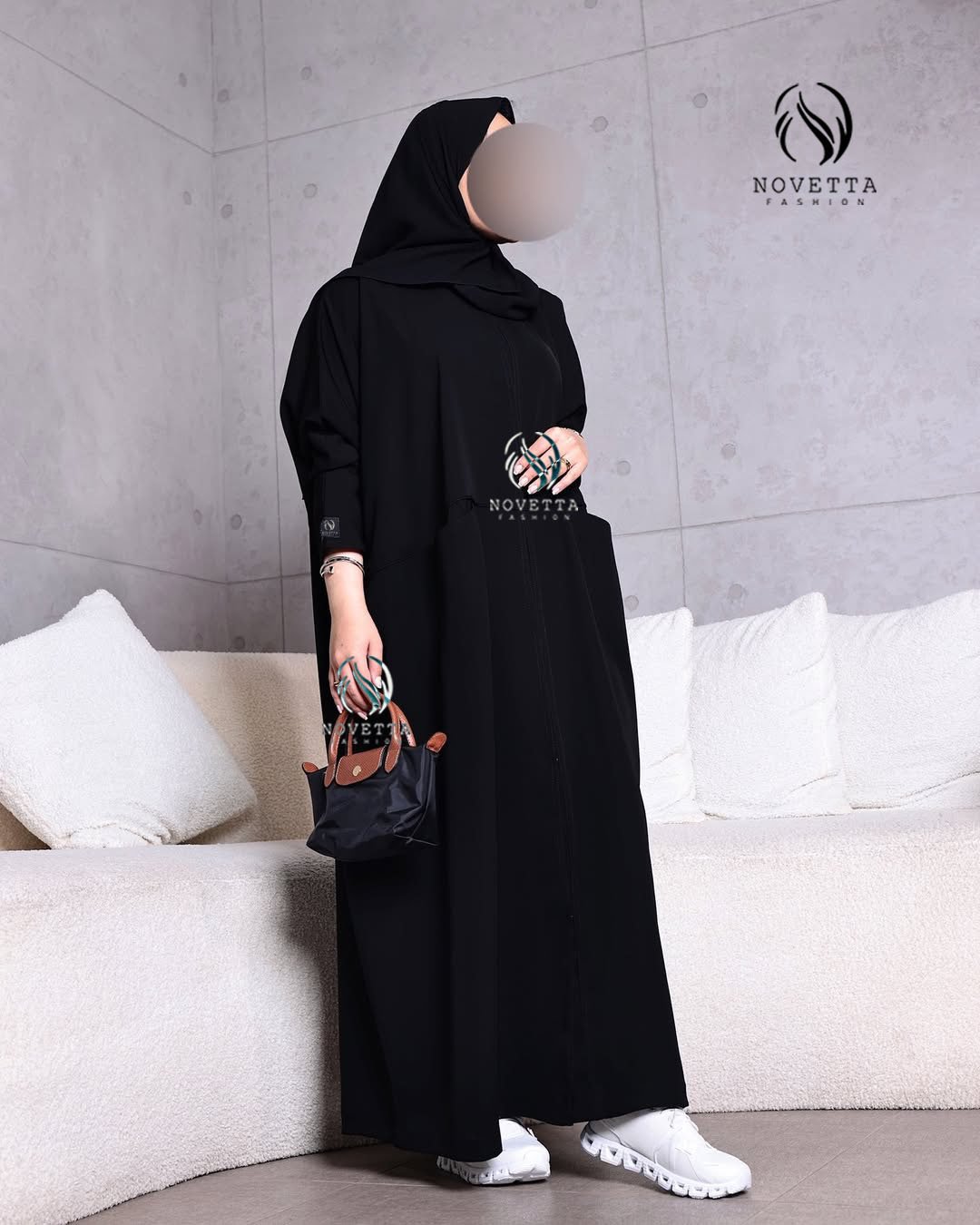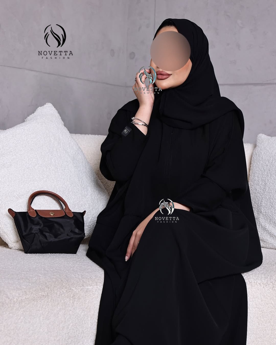 قماش فاخر بانسدال سلس، ينساب مع حركتك بثقة، ليمنحك إطلالة تجمع بين القوة والنعومة في آنٍ واحد. بخامة كريب كوري اسود داكن هدلة وناعمة