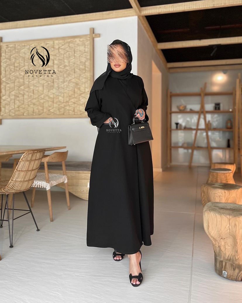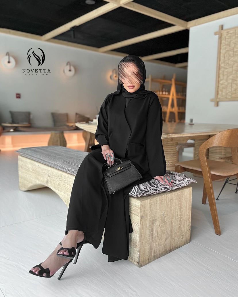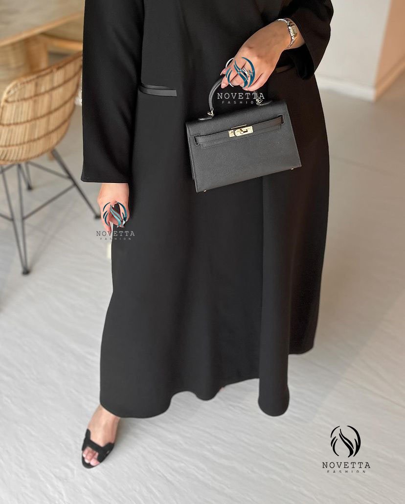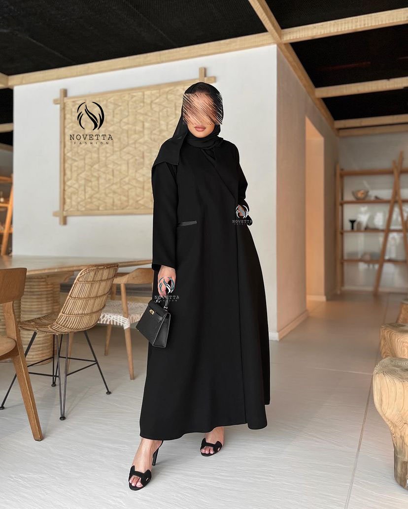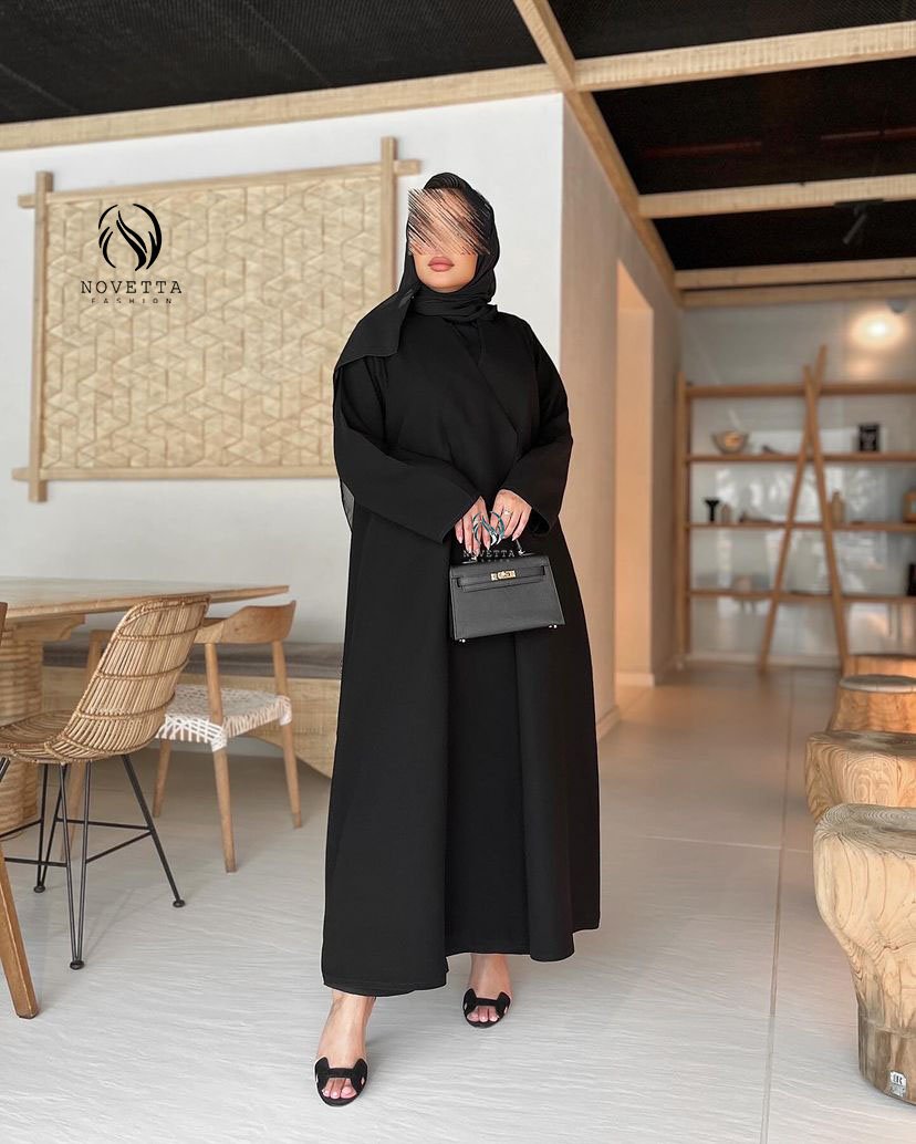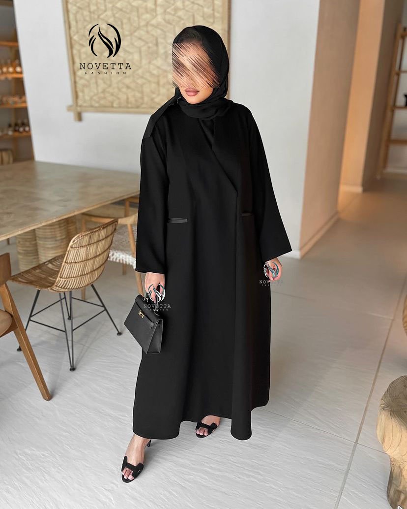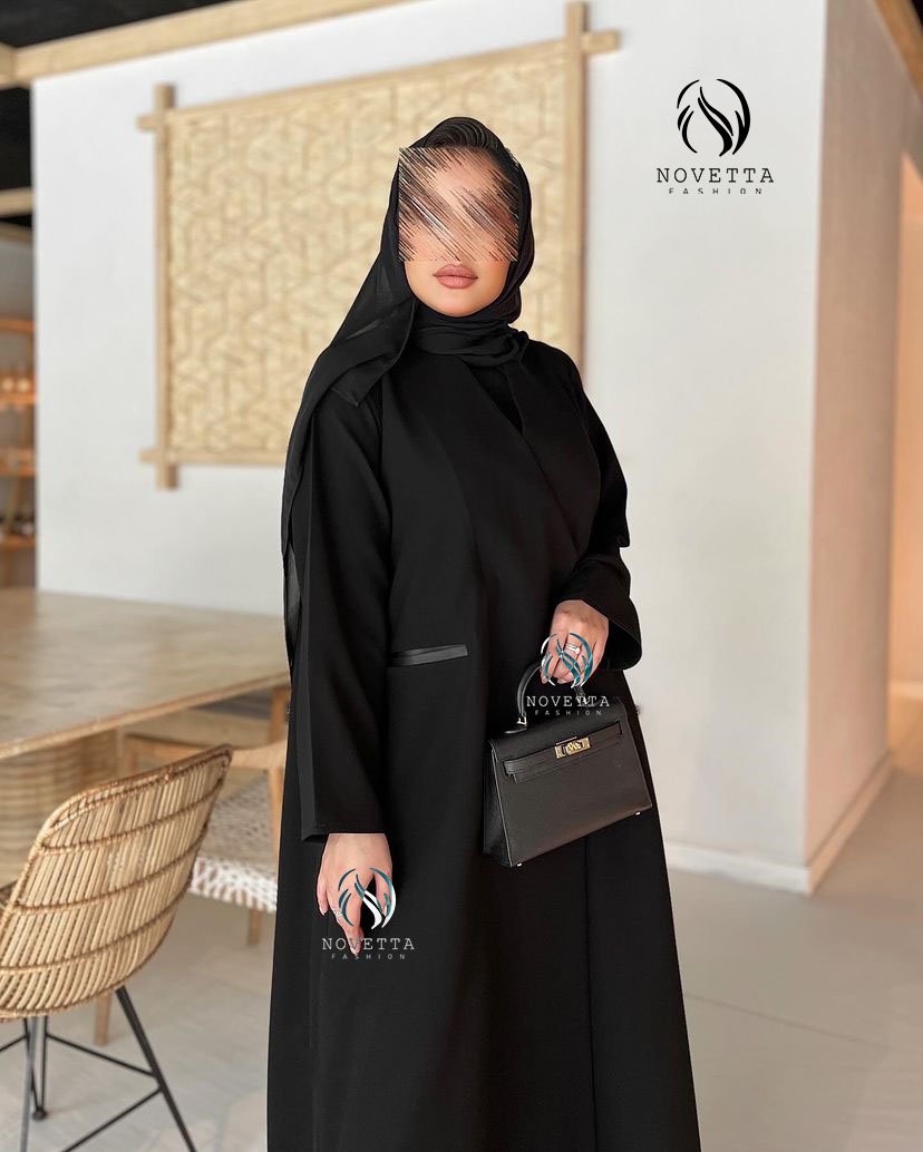 عباية بقصّة انسيابية تمنحك حضورًا مترفًا، تتناغم مع تفاصيل دقيقة وخط ستان راقٍ يزيّن الجيوب بلمسة لامعة تضيف بعدًا أنيقًا للتصميم بخامة كوبرا اندونيسي اسود داكن هلدة وناعمة