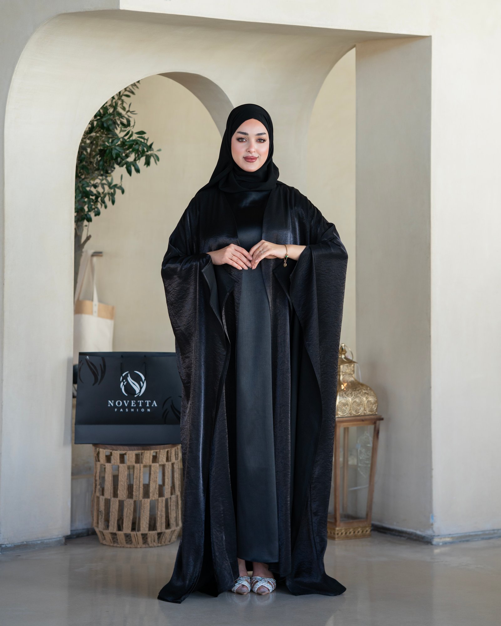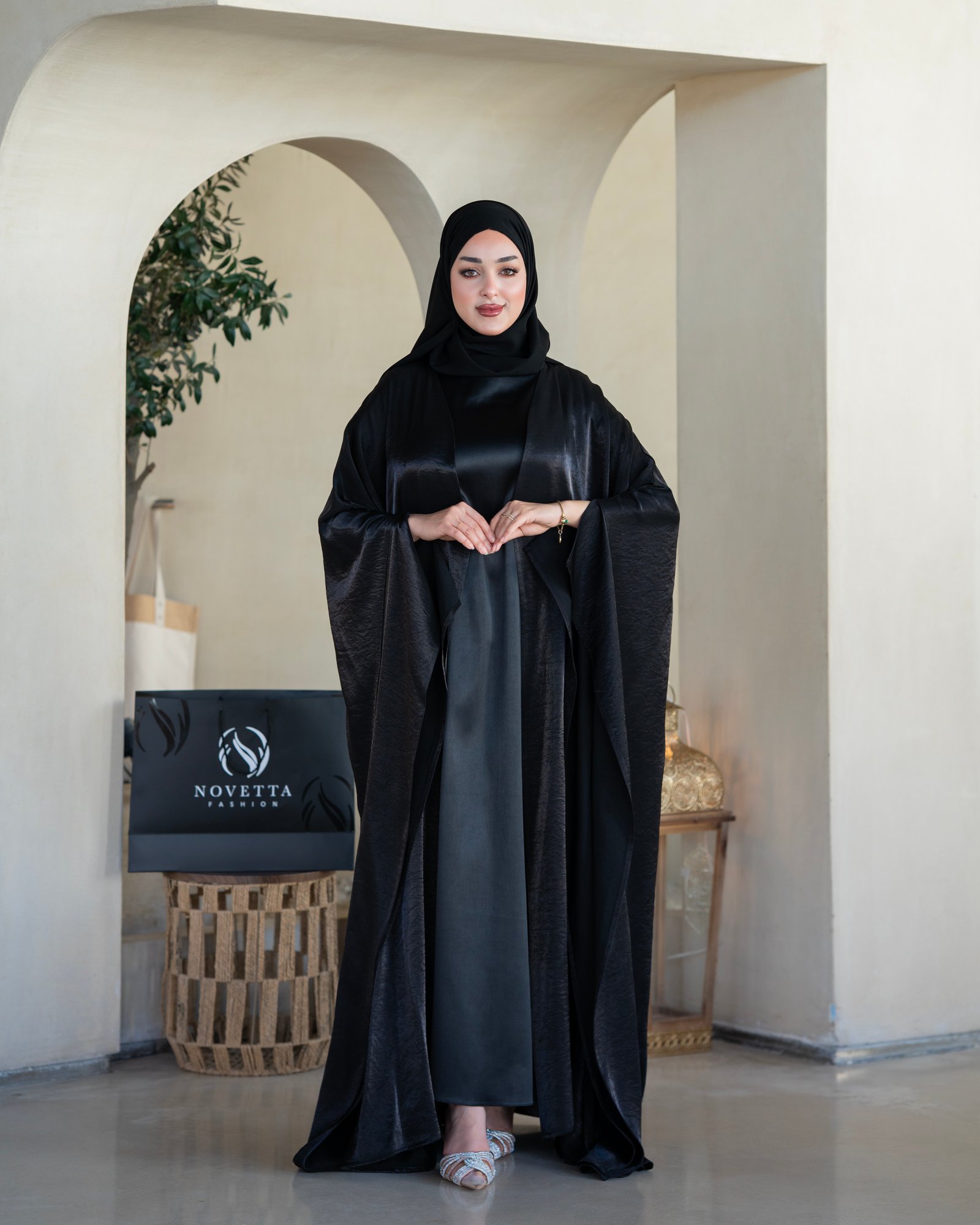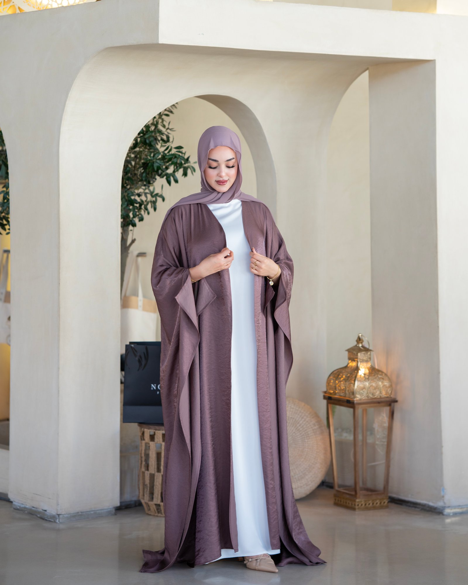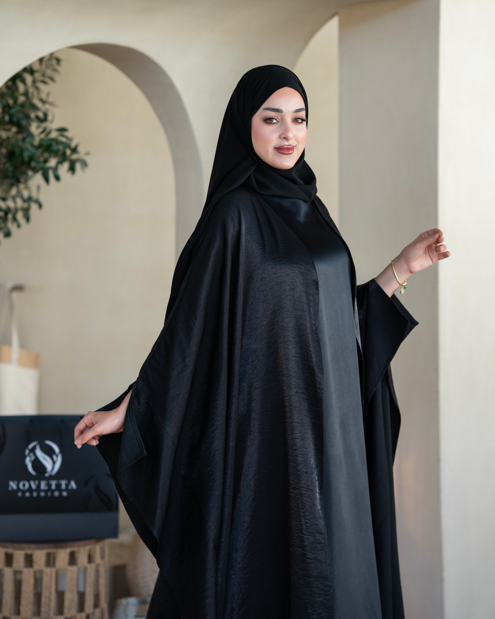 يتميز بقصة واسعة وانسيابية تمنح إطلالة محتشمة وأنيقة، مع خامة ناعمة بلمعة خفيفة تضيف لمسة فاخرة للمظهر.