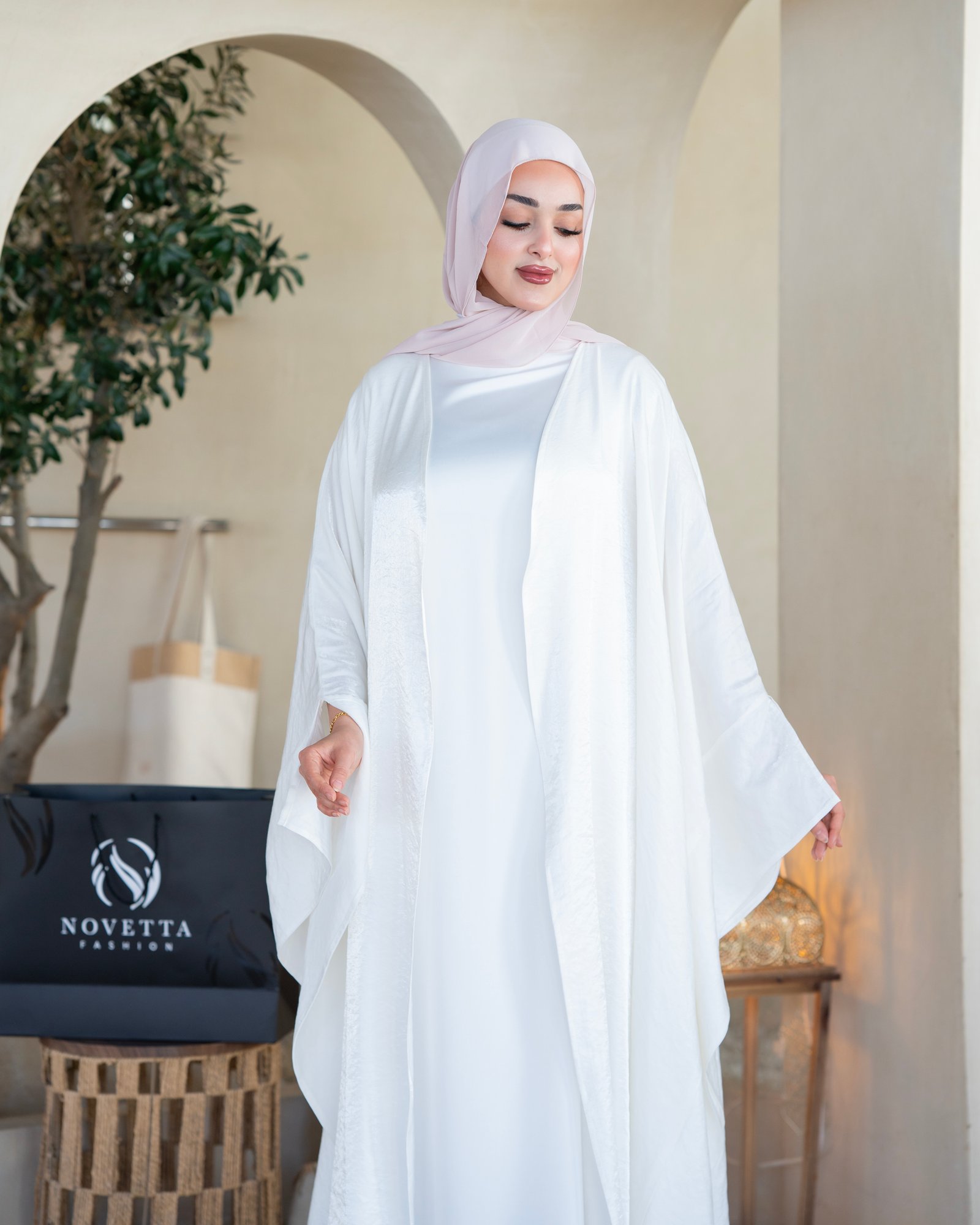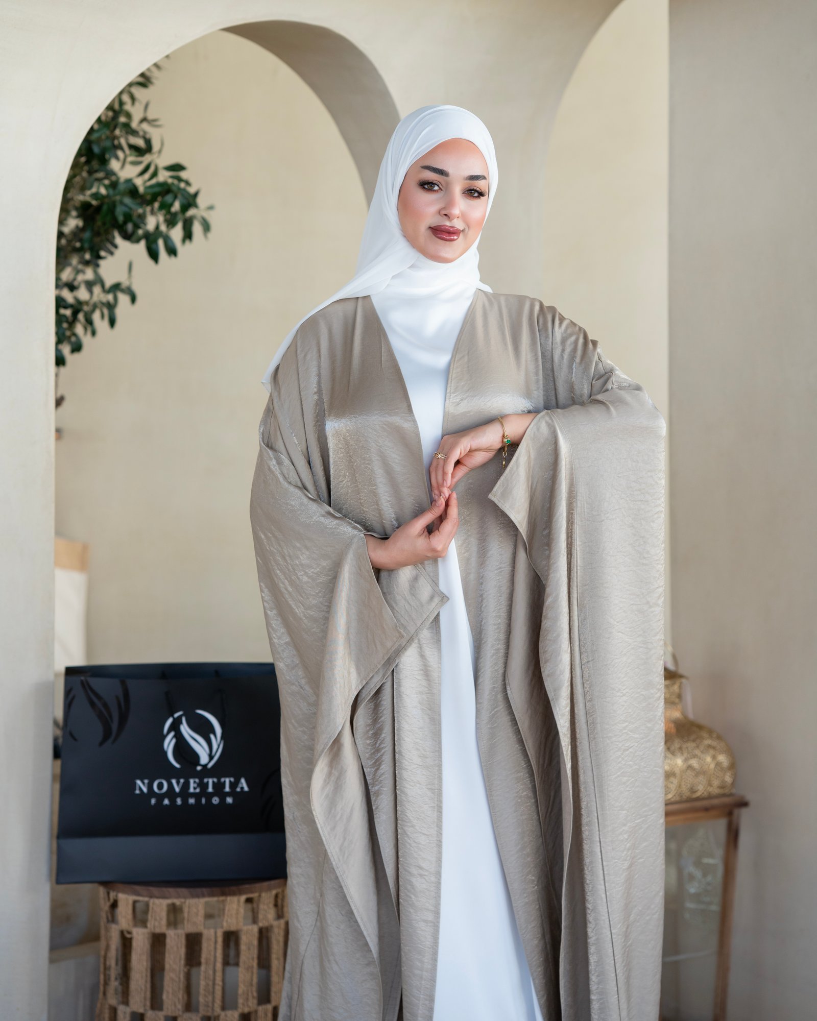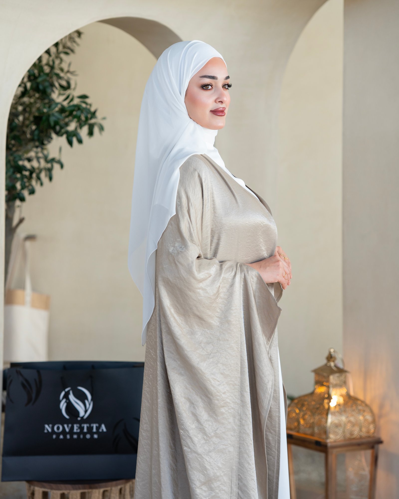 يتميز بقصة واسعة وانسيابية تمنح إطلالة محتشمة وأنيقة، مع خامة ناعمة بلمعة خفيفة تضيف لمسة فاخرة للمظهر.