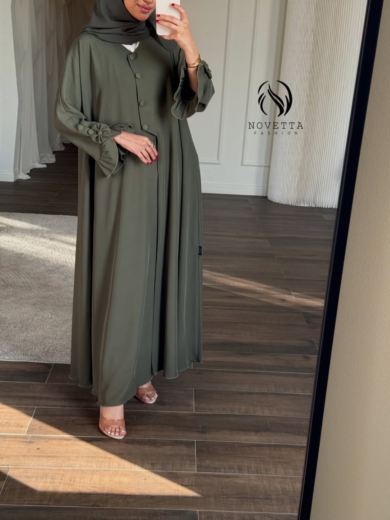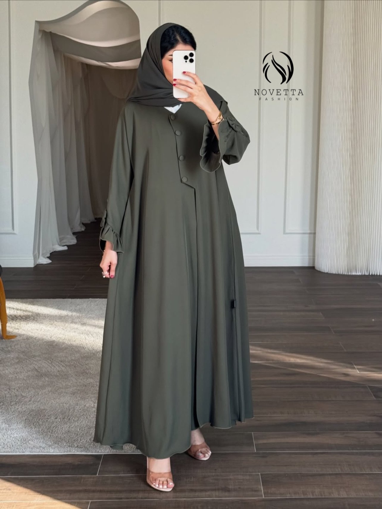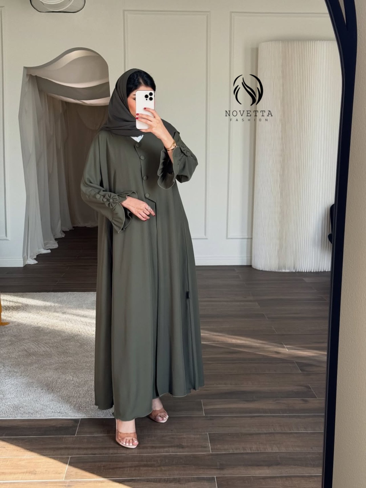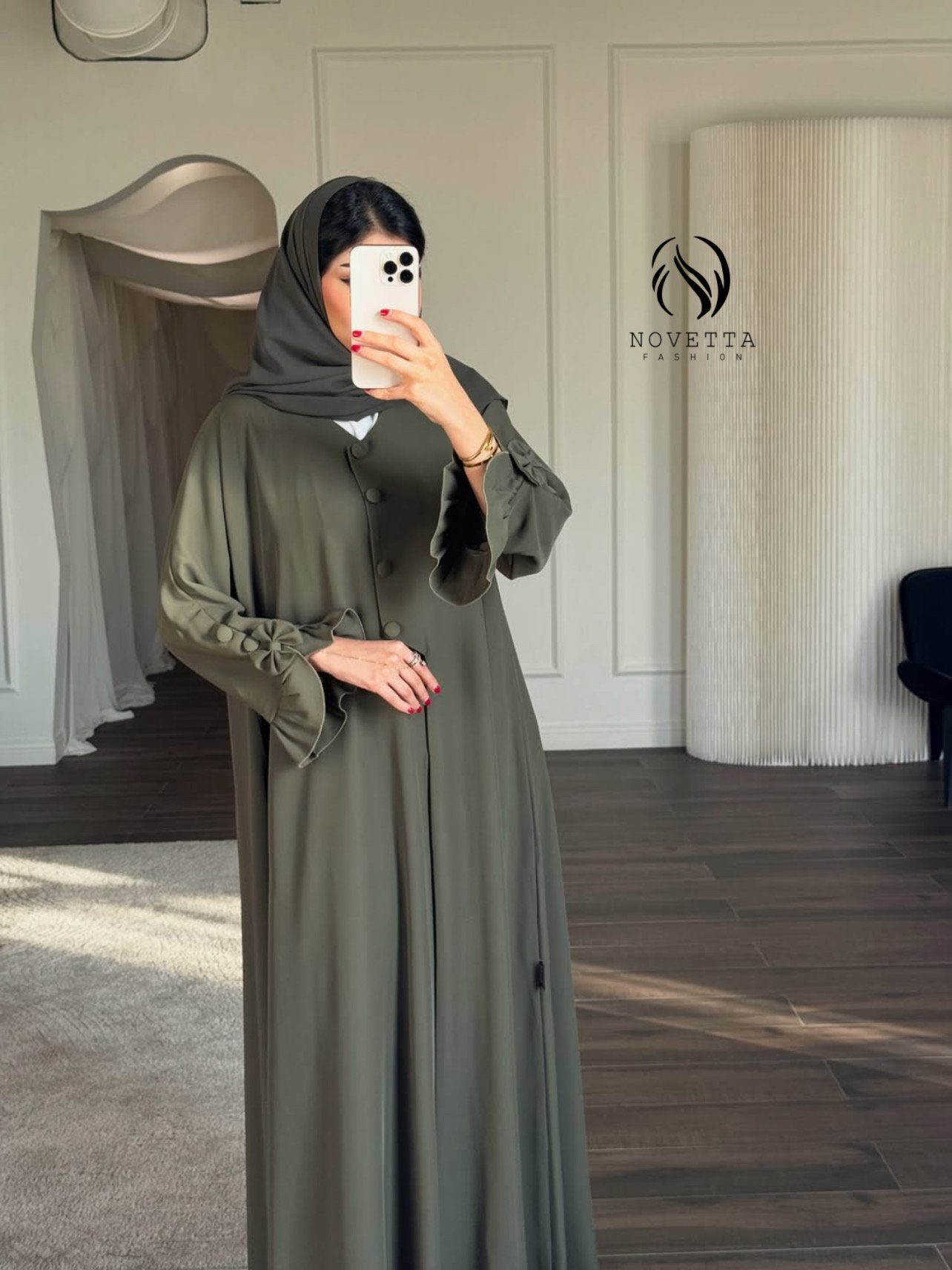 عباية تنساب بانسيابية ملكية تعانق الحركة بنعومة، وتزيّن الأكمام بيونة أنثوية راقية تمنح الإطلالة بُعدًا مترفًا وحضورًا لا يُشبه سواه الخامة: برادا هدلة وناعمة
