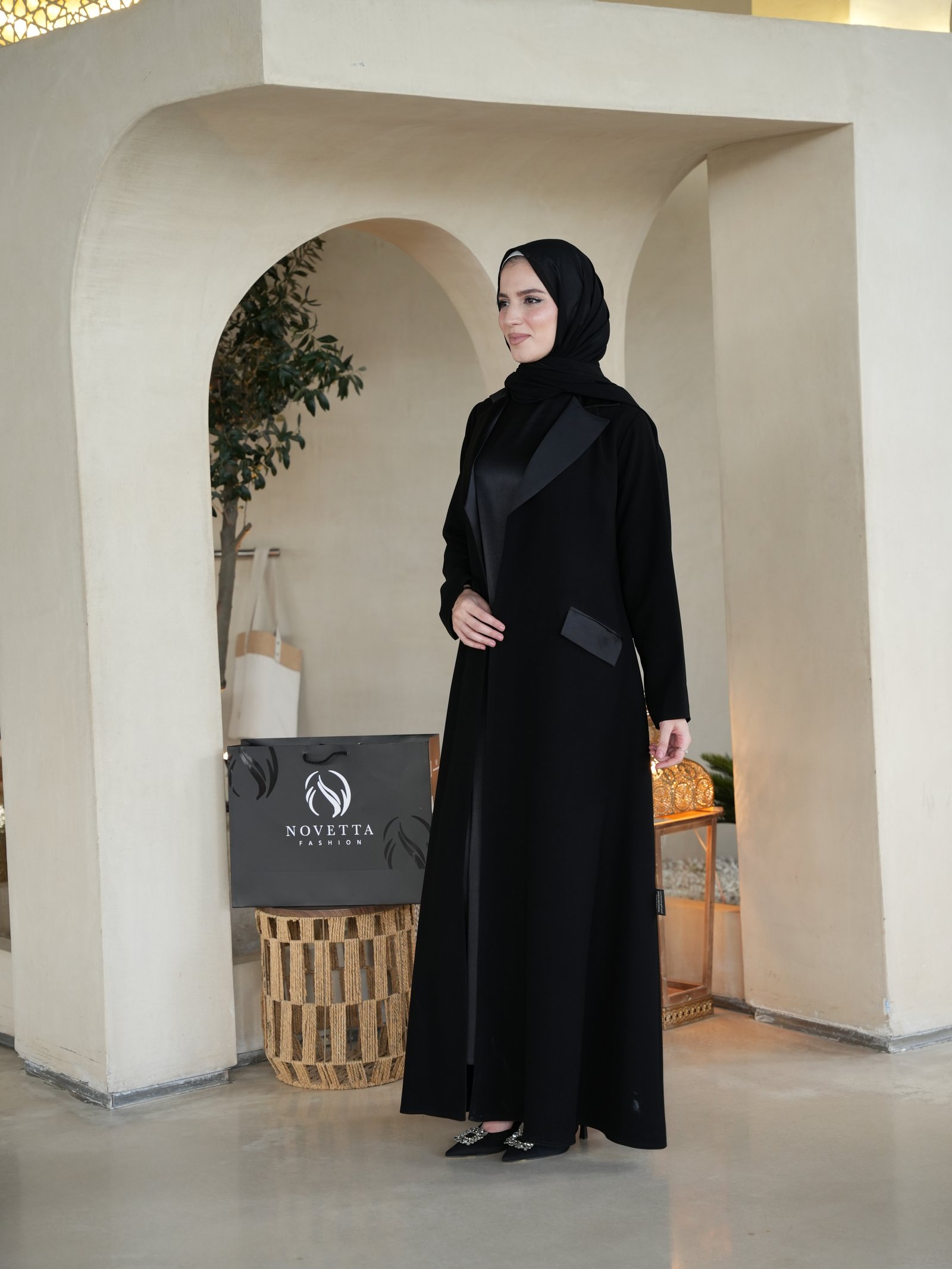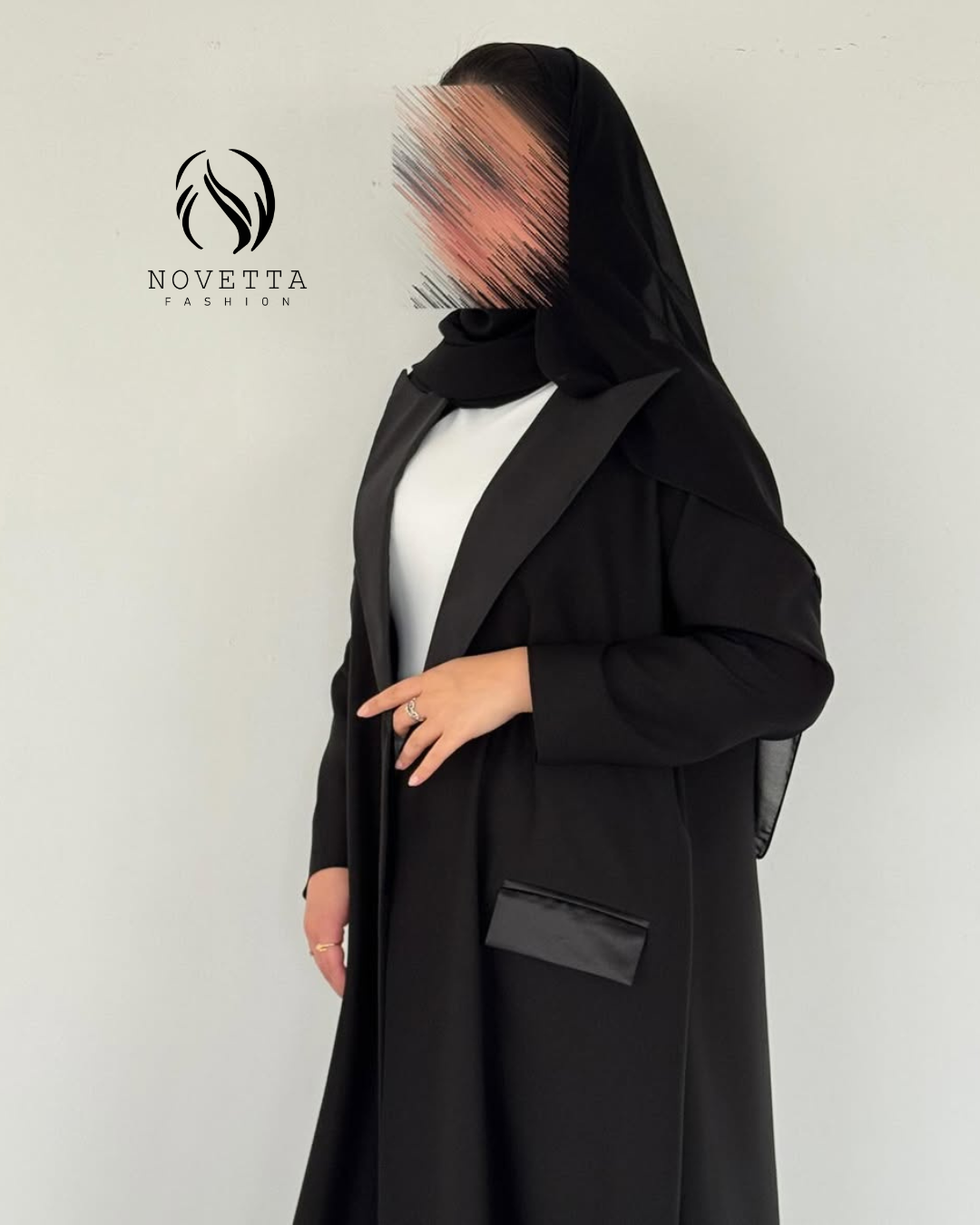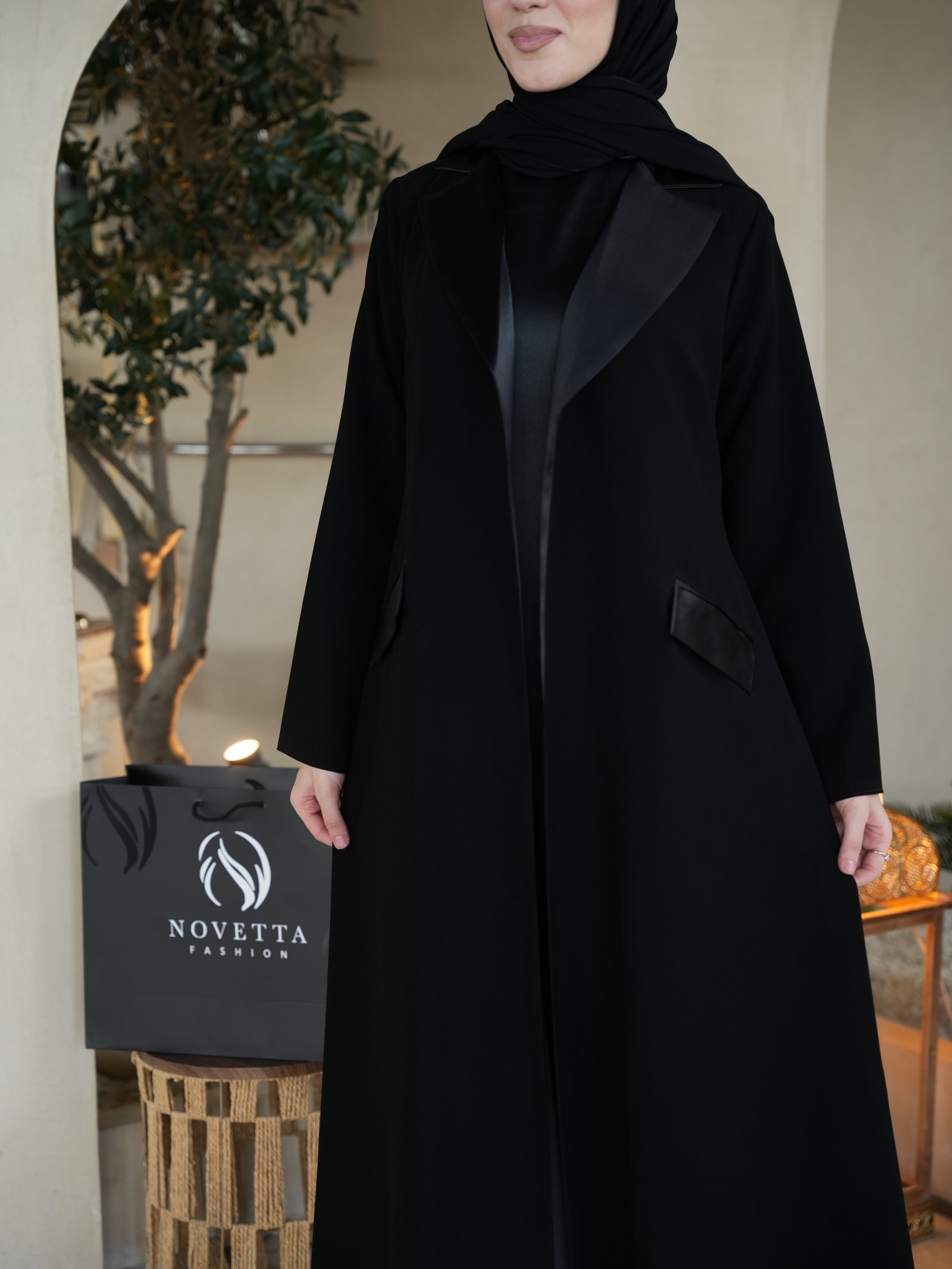 عباية تجسّد الرفعة والهيبة، بقصّة بليزر أنيقة ولمسات جلدية تضيف بريق فخامة خريفيّة كلاسيكية , بخامة كوبا بورتريكو كورية تقيلة وهدلة وناعمة وسواد داكن مع ستان زارا والمقاسات وافية واسعة