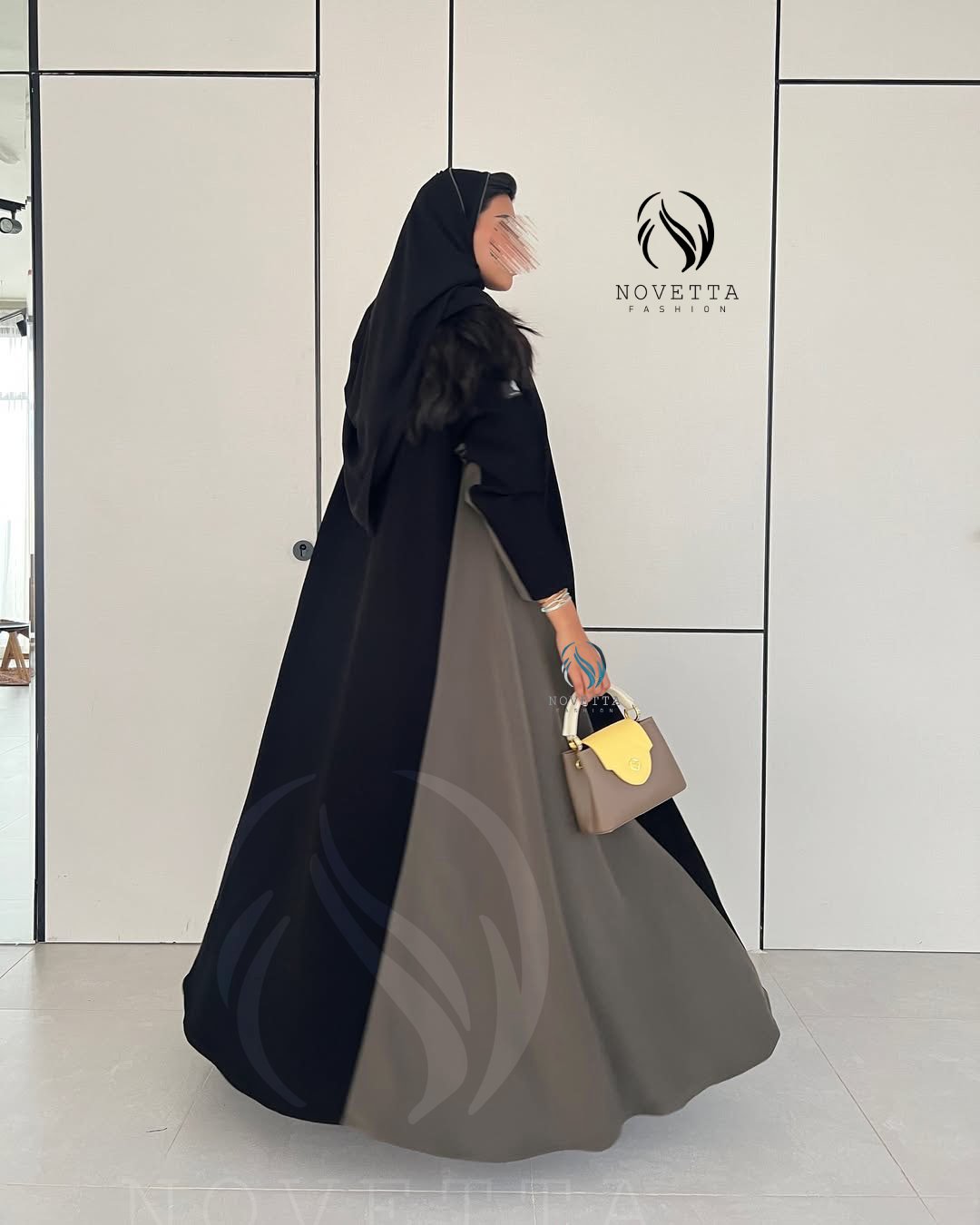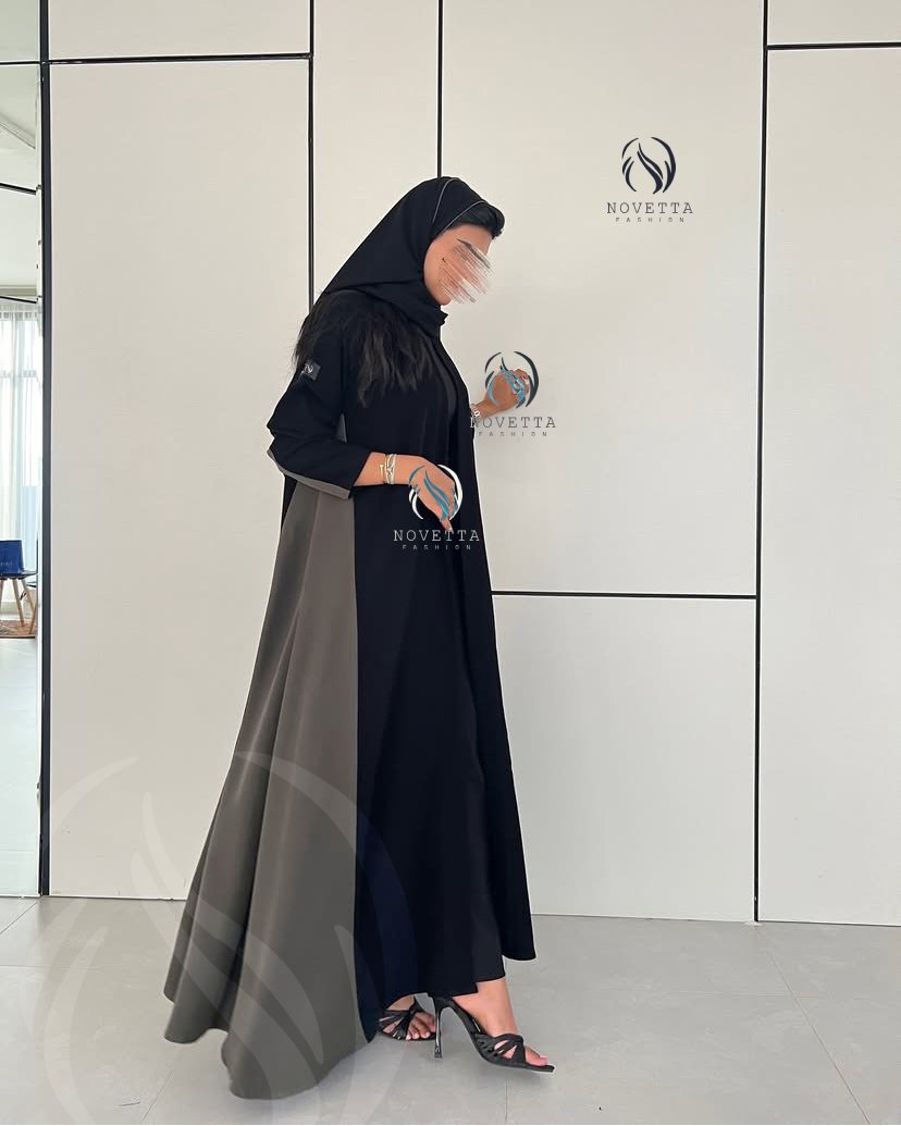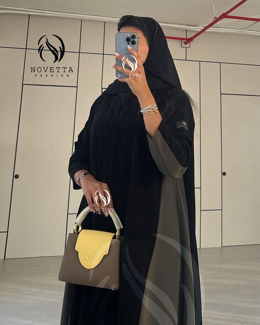 عباية أنيقة بتصميم طولي يجمع بين الأسود العميق والزيتي الغامق، تمنحك إطلالة فاخرة بخامة كريب اندونيسي والمقاسات وافية و واسعة