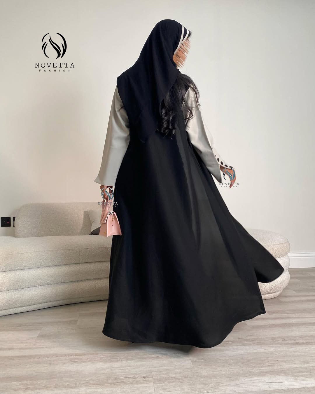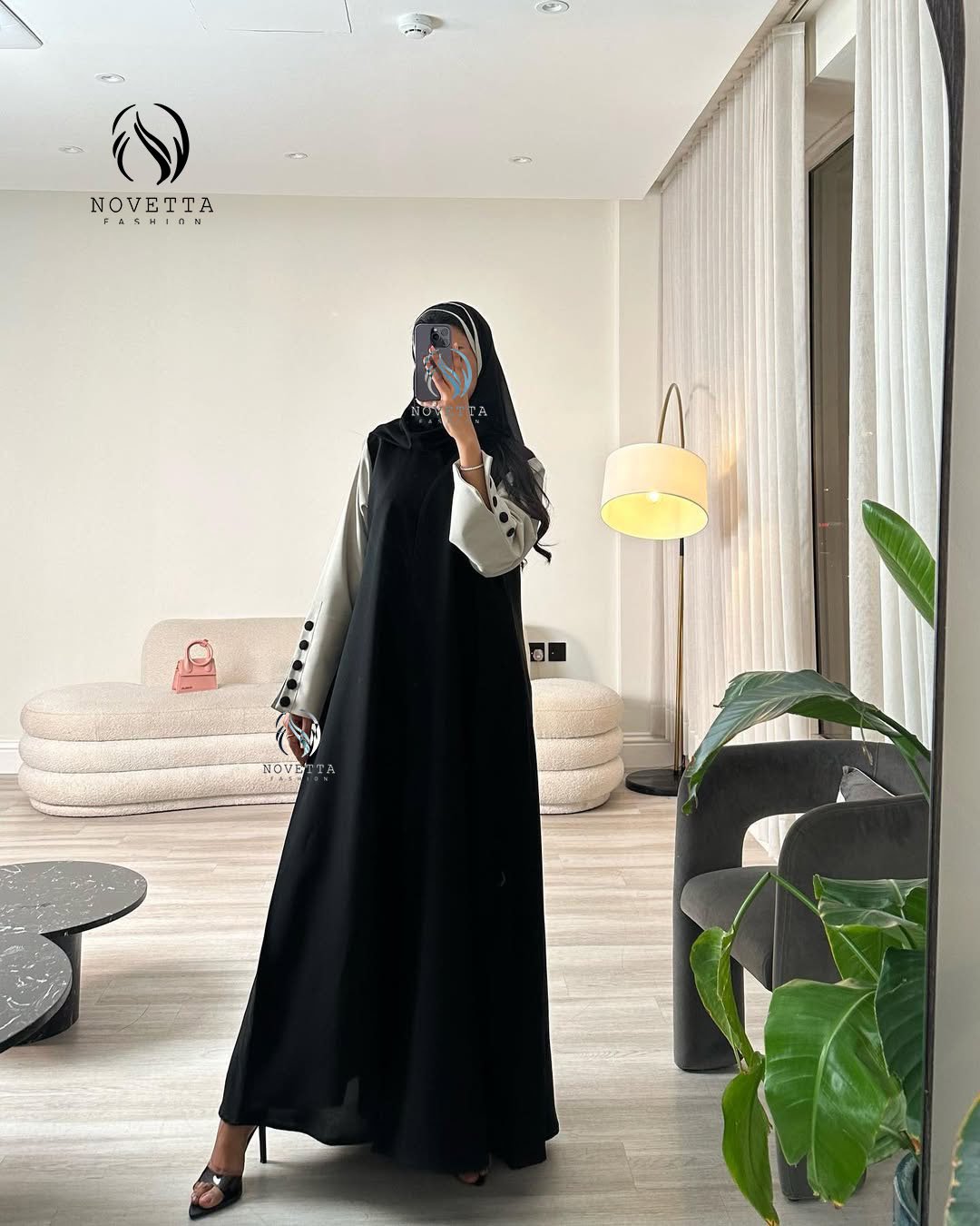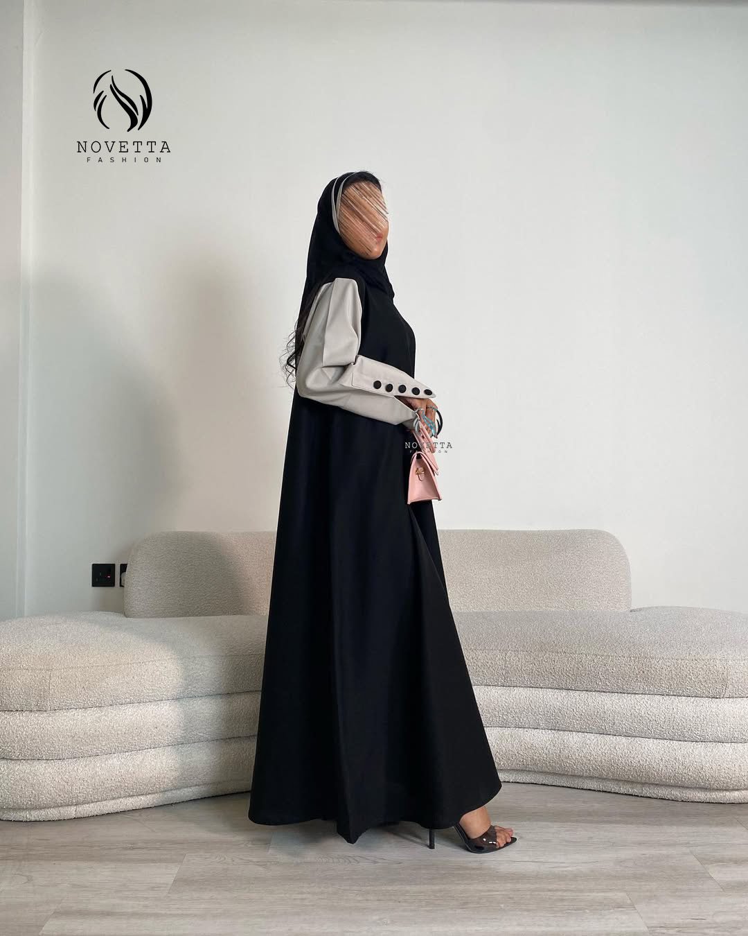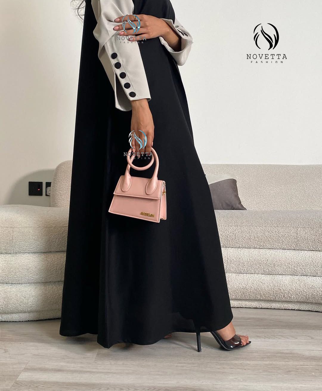 عباية بلون أسود أنيق بتصميم واسع، متميزة بأكمام بيج مزينة بأزرار سوداء بخامة كريب كوري اسود والمقاسات وافية وواسعة