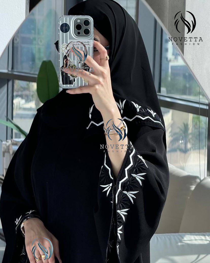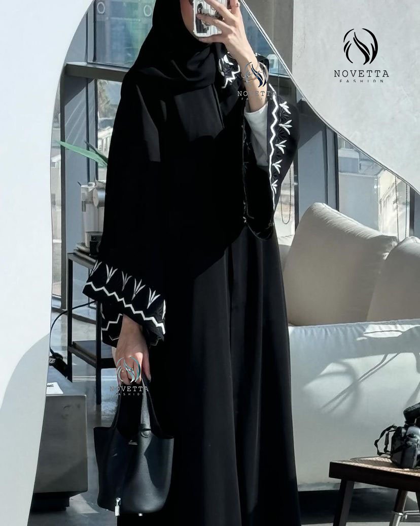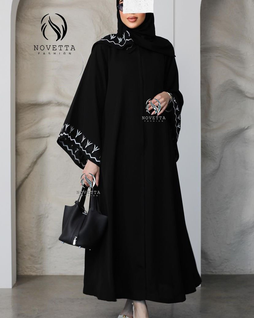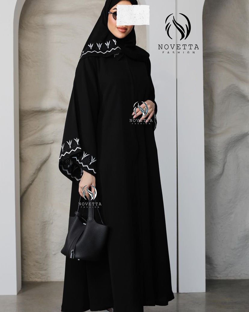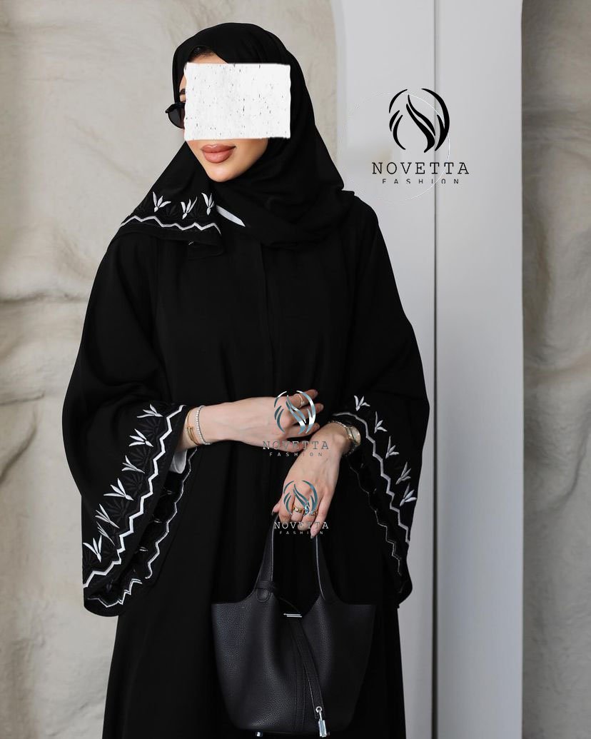 عباية سوداء مطرزة بخيوط بيضاء ناعمة مستوحاة من رمش العين، تطريزها الأنثوي على الأكمام والطرحة يضيف لمسة فنية ناعمة تليق بالذوق الرفيع.بخامة كريب اندونيسي والمقاسات وافية وواسعة