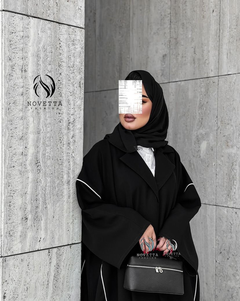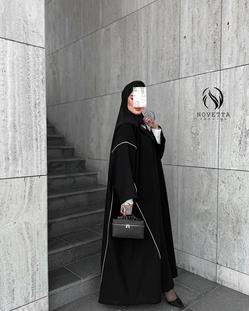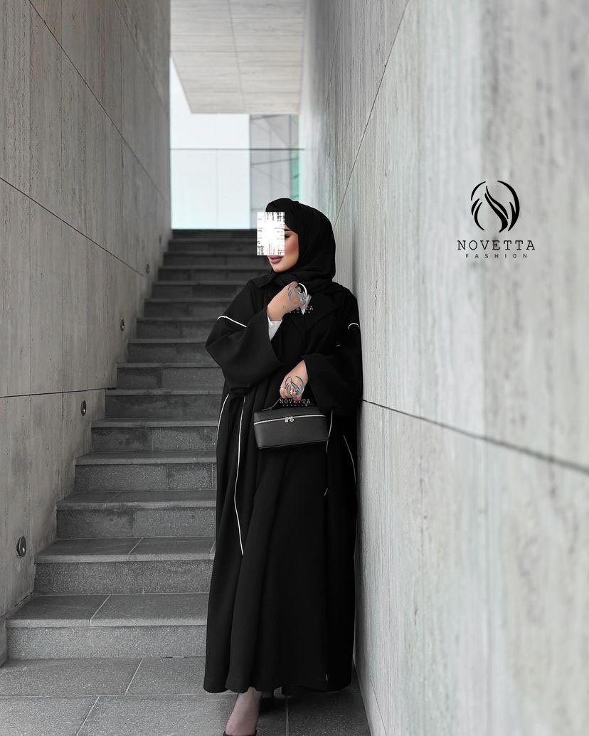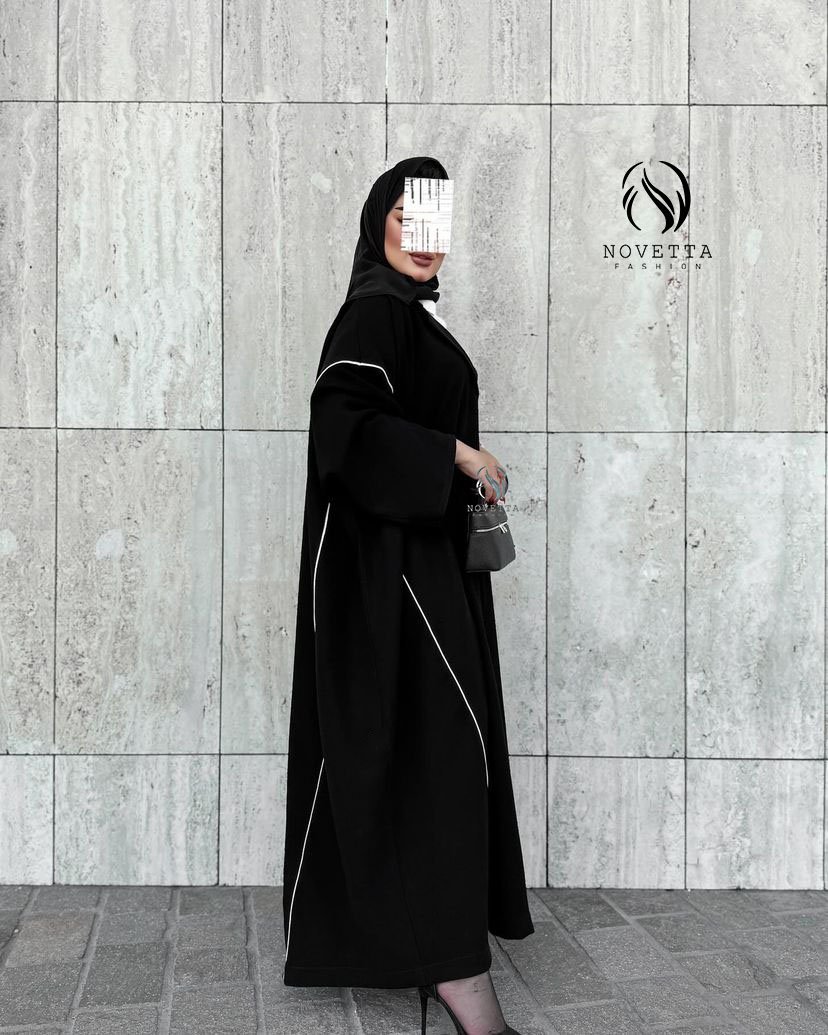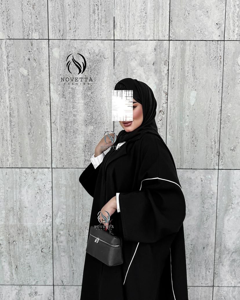 عباية سوداء فاخرة بتفاصيل بيضاء رفيعة تنسدل بانسيابية، تصميم يجمع بين البساطة والرقي بخامة حبر اندونيسي
