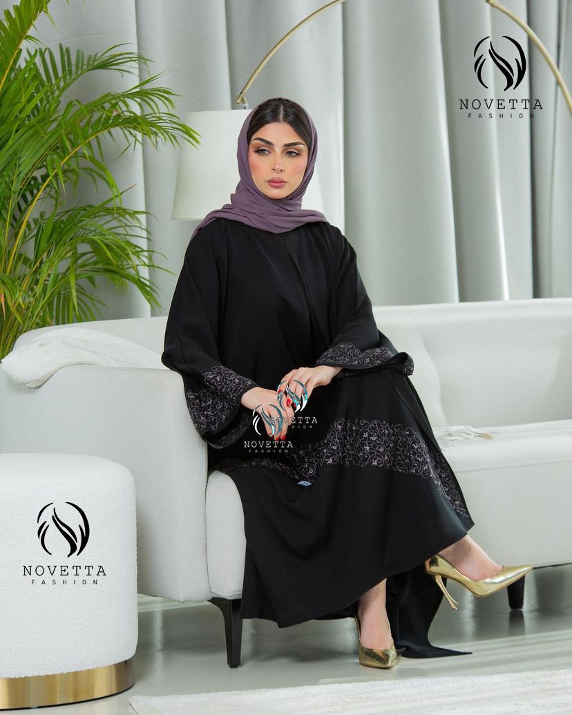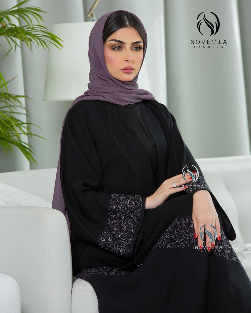 عباية سوداء بتفاصيل تطريز بنفسجي ملكي فاخر على الكم والحاشية، تدمج بين الرقي والبساطة، مثالية للإطلالات الرسمية والأنثوية.بخامة حبر الفرسان