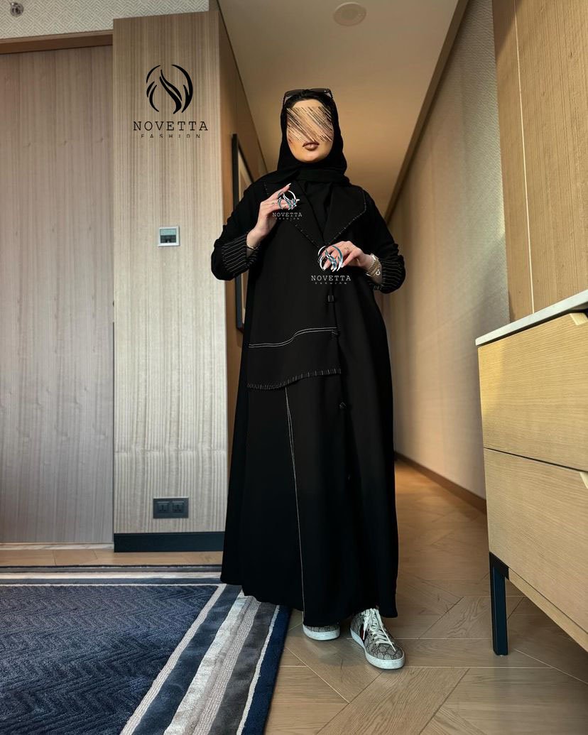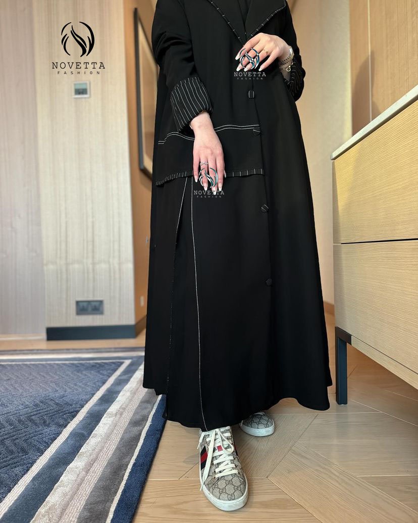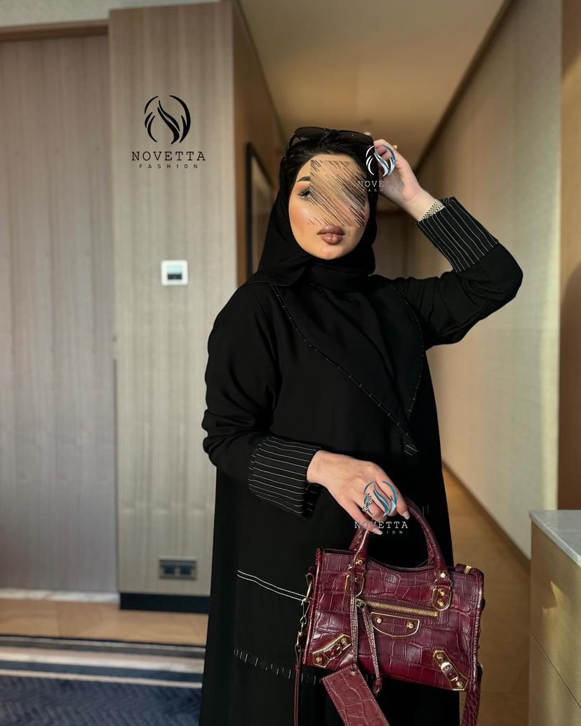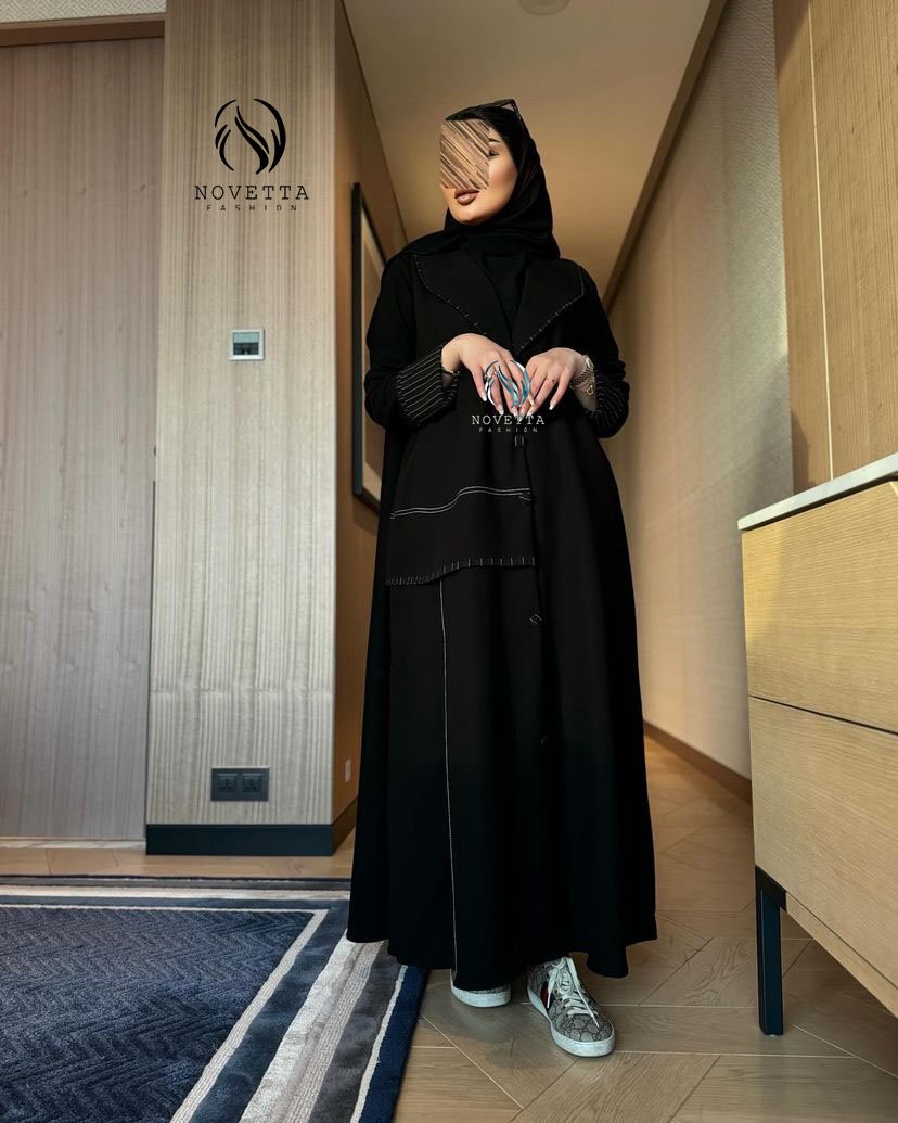 عباية سوداء أنيقة بتفاصيل خطوط دقيقة على الأكمام والحواف تضيف لمسة جريئة وعصرية، تصميمها مريح ويناسب الإطلالات الرسمية واليومية.بخامة كريب اندونيسي والمقاسات وافية وواسعة