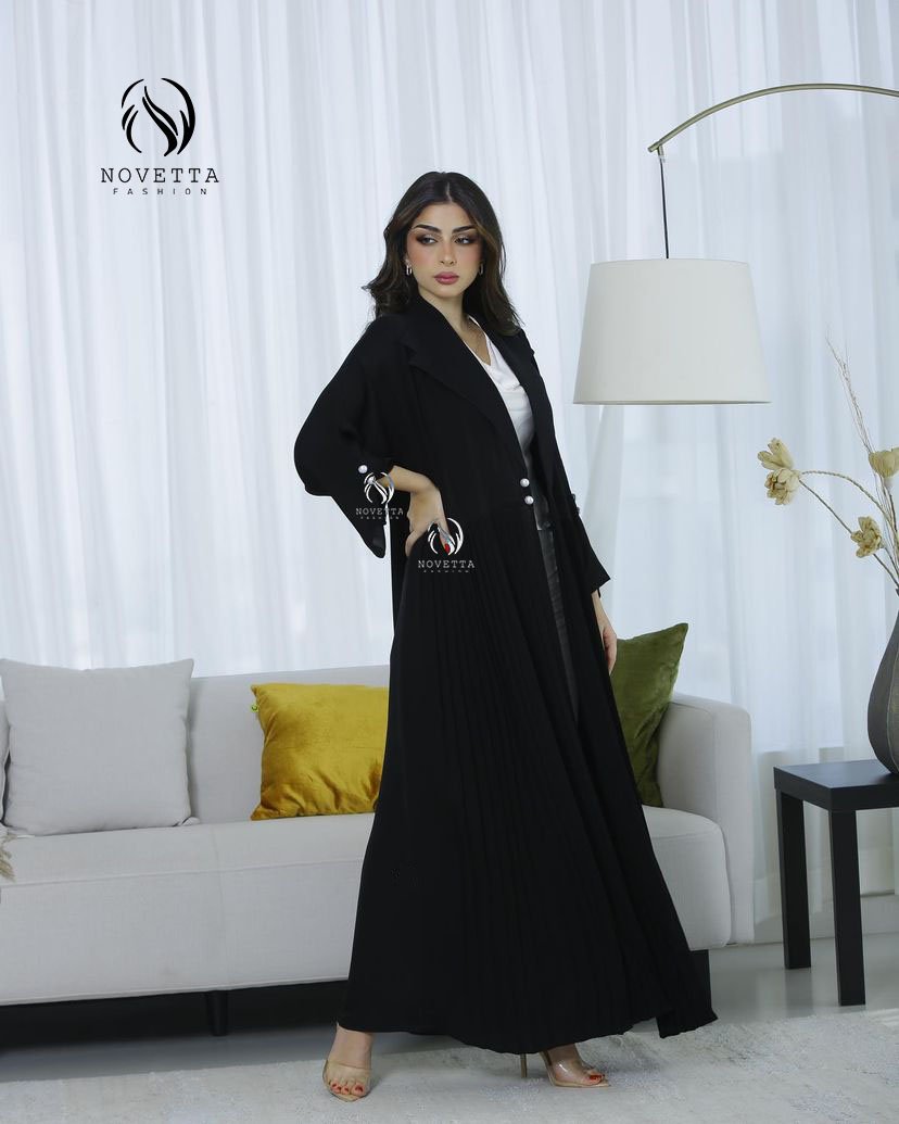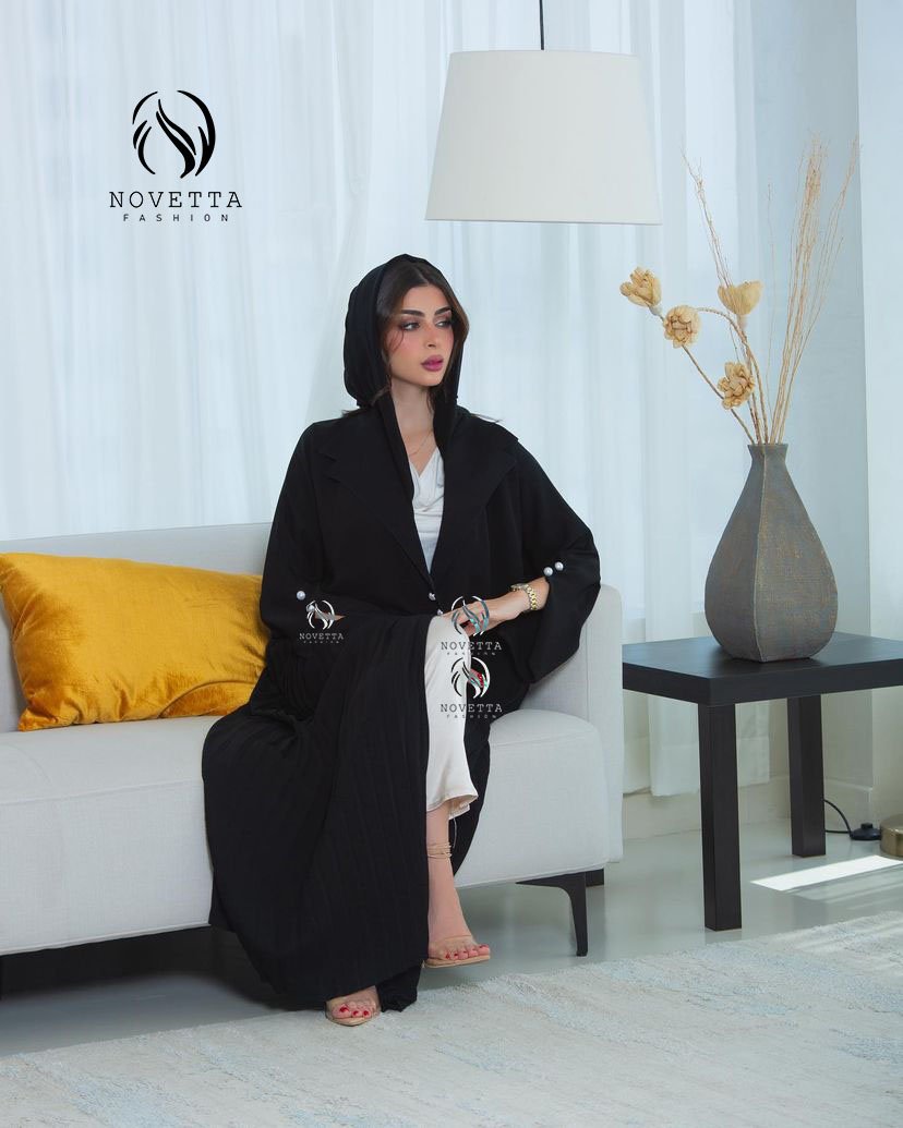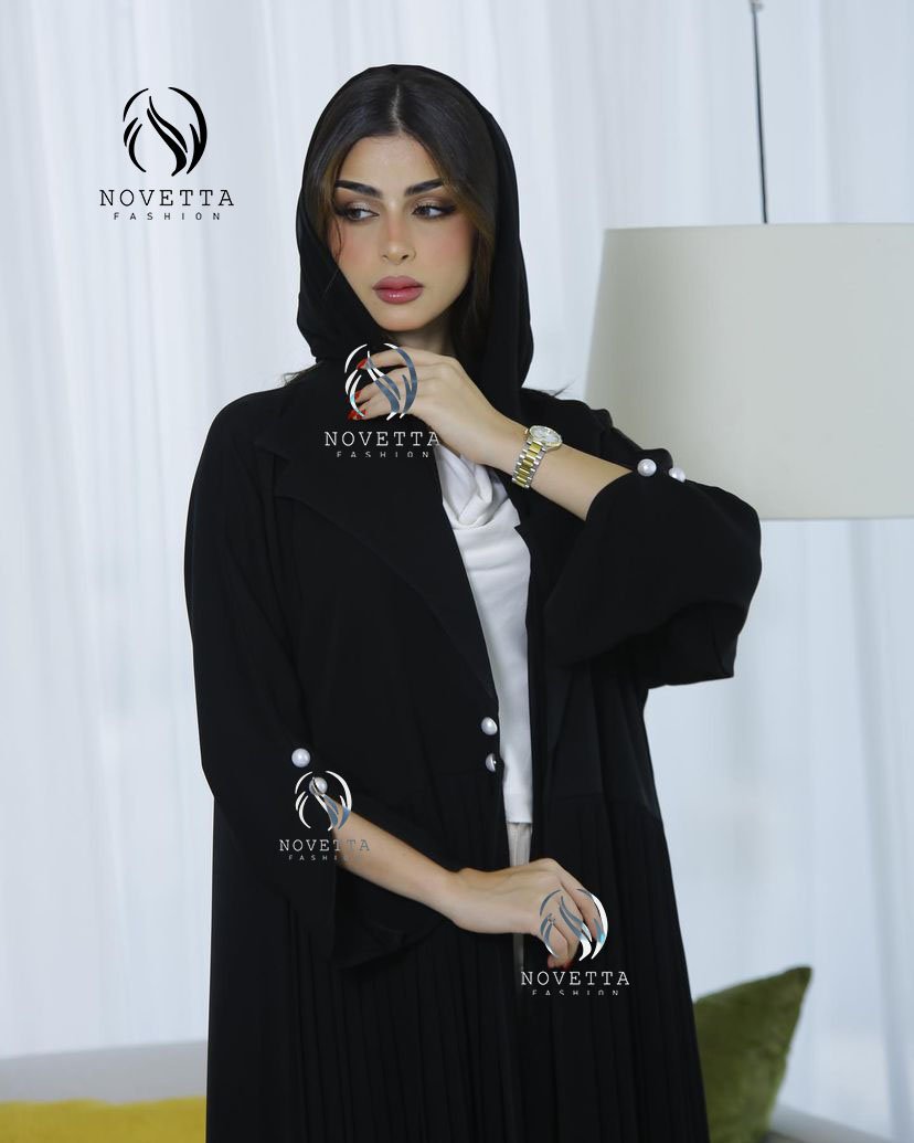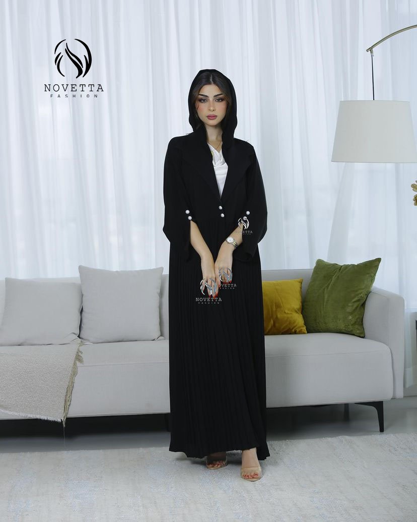 عباية سوداء بقبعة عصرية وتفاصيل أزرار لؤلؤية على الأكمام، مع كسرات ناعمة تضيف لمسة أنثوية فاخرة تجمع بين العملية والرقي.بخامة حبر الفرسان كوري اسود داكن والمقاسات وافية وواسعة
