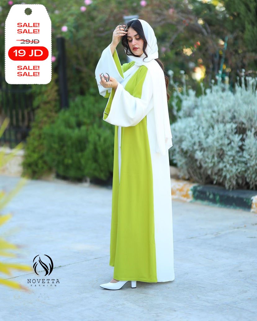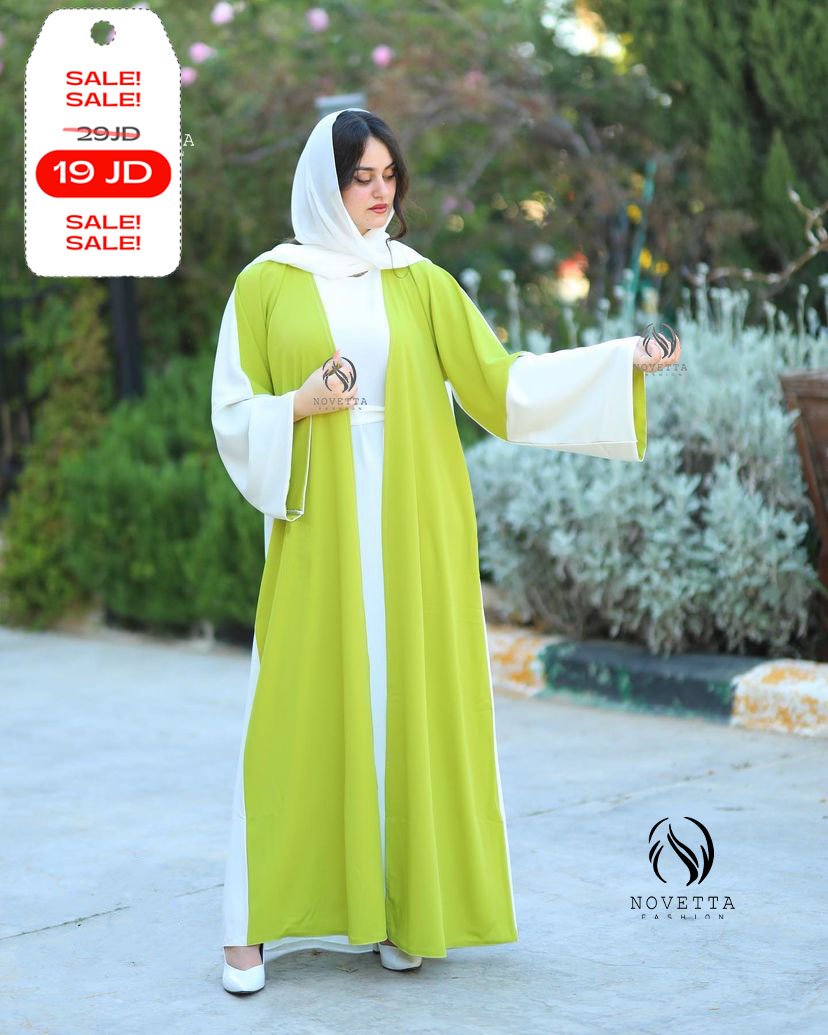 عباية صيفية أنيقة بلون أبيض نقي مع لمسة أخضر ليموني منعشة، تمنحك إطلالة مشرقة مليئة بالحيوية والأنوثة.بخامة برادا والمقاسات وافية وواسعة