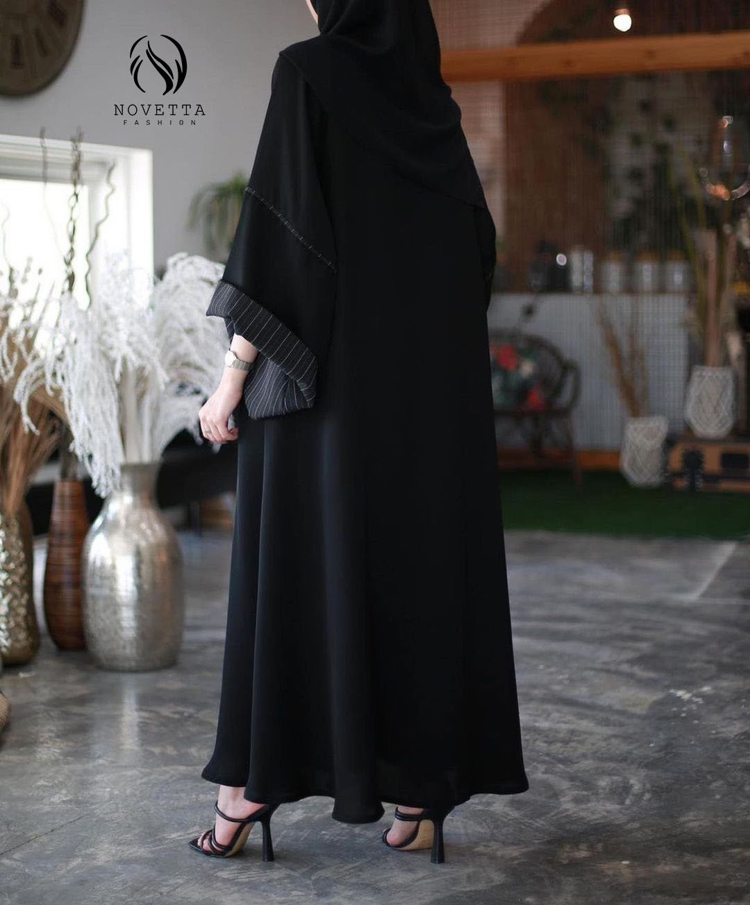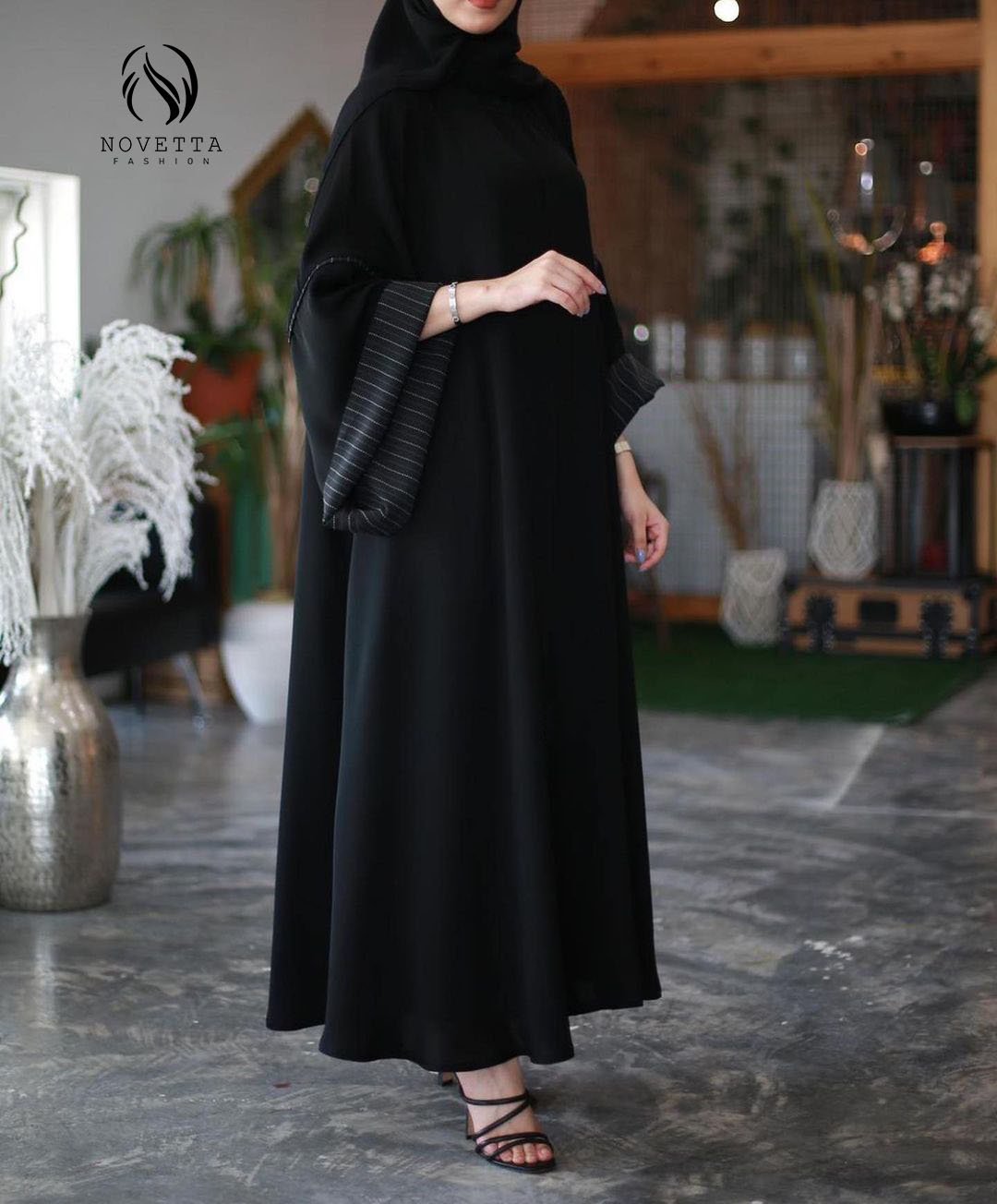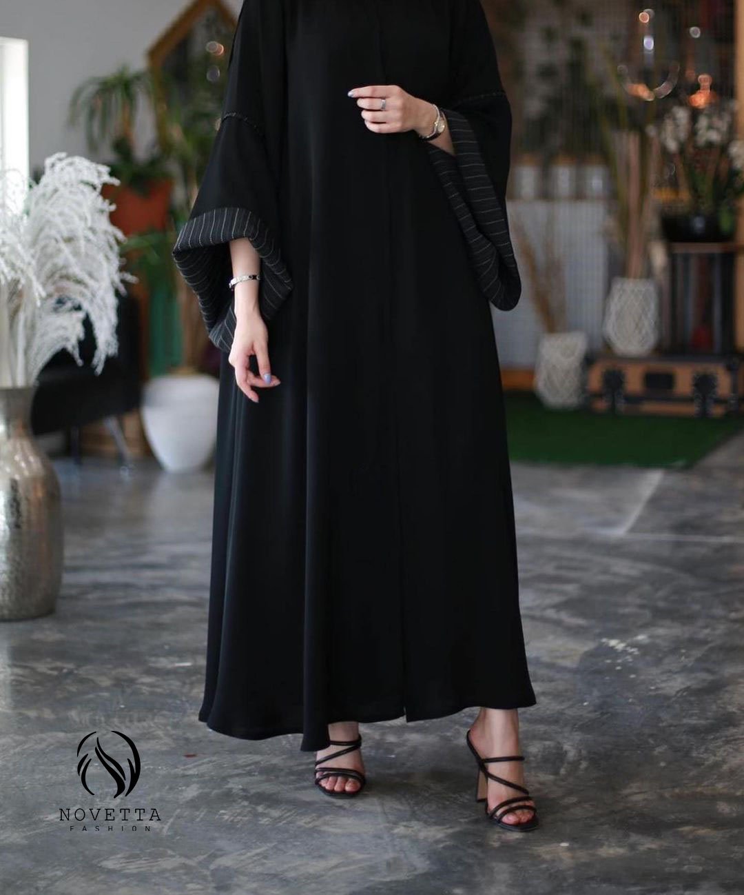 عباية سوداء أنيقة بكم واسع مع تفصيلة بطانة مخططة تضيف لمسة عصرية على التصميم الكلاسيكي.بخامة كريب اندونيسي