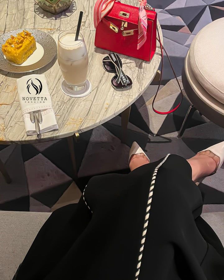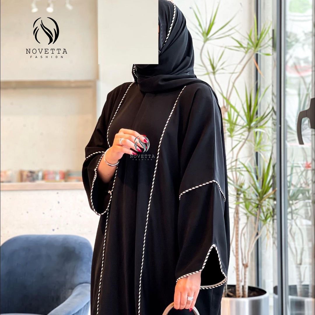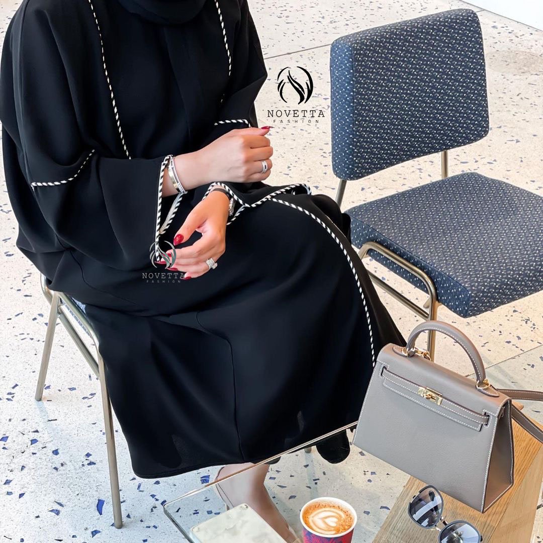 عباية خطوط مقلمة، عبايات سوداء، عبايات فخمة، موديل جديد 2025، عبايات نوفِيتا، عباية عصرية، عباية عملية