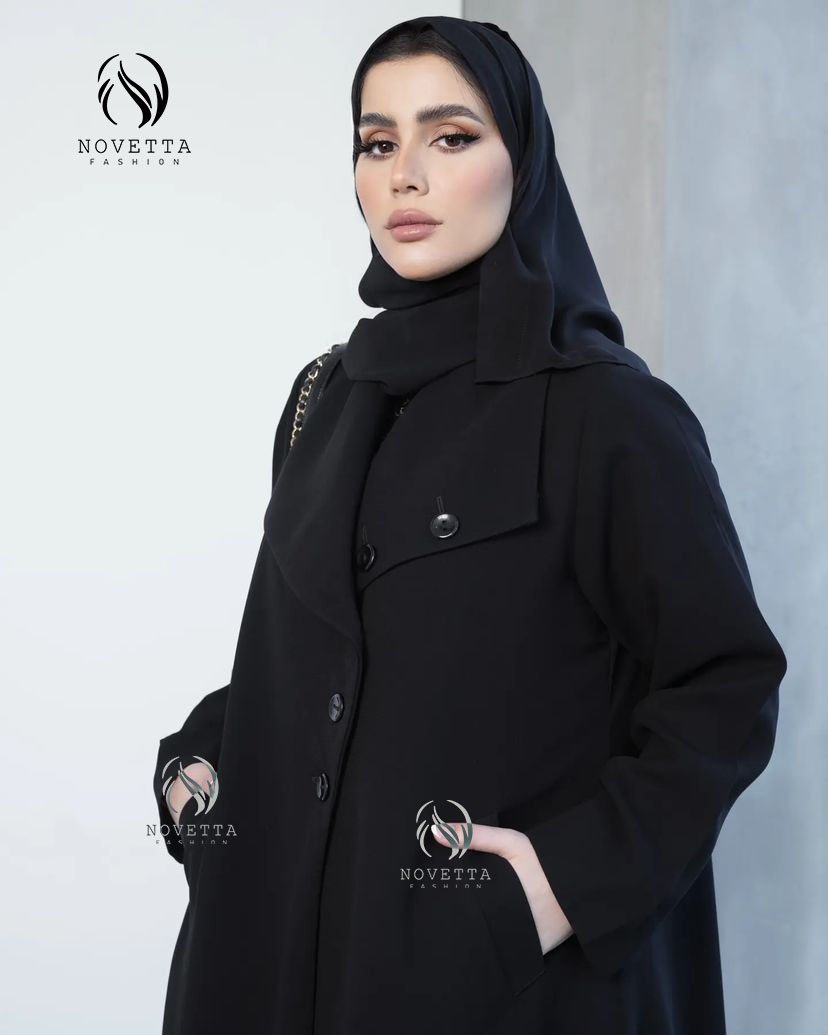 عباية سوداء بتصميم جاكيت كلاسيكي مع ياقة واسعة وأزرار أمامية، لإطلالة تجمع بين الرقي والقوة.بخامة شمواه تقيل والمقاسات وافية وواسعة