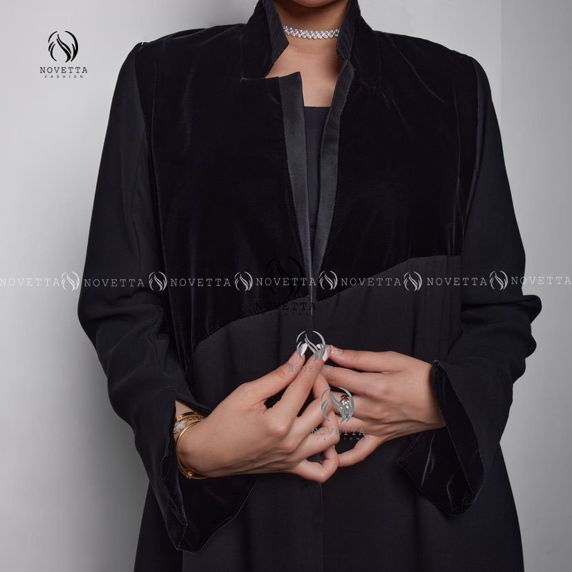 عباية سوداء بتصميم مخملي على شكل زاوية مع ياقة وأكمام ناعمة، تضيف لمسة فخامة وعصرية في إطلالة واحدة.بخامة مخمل اسود و باندوراما