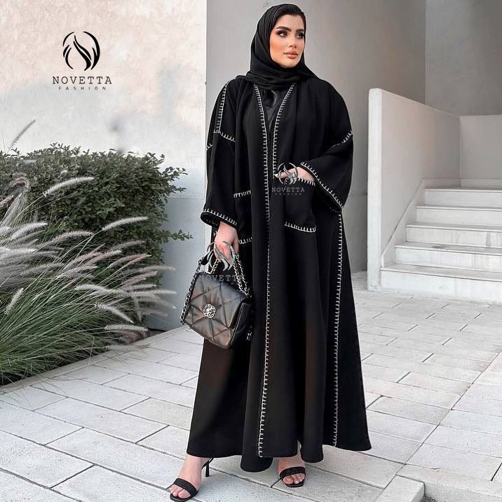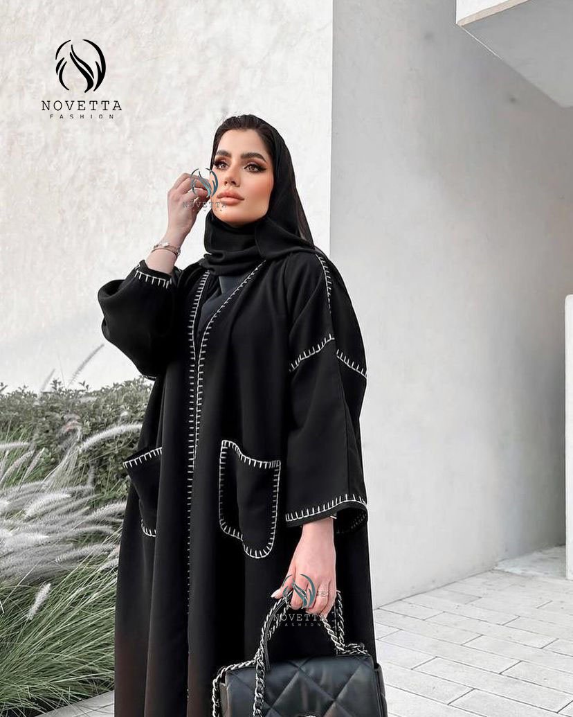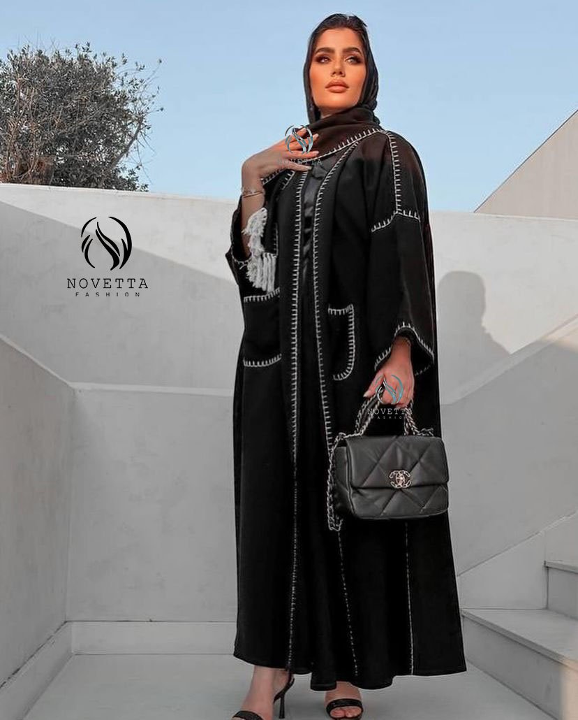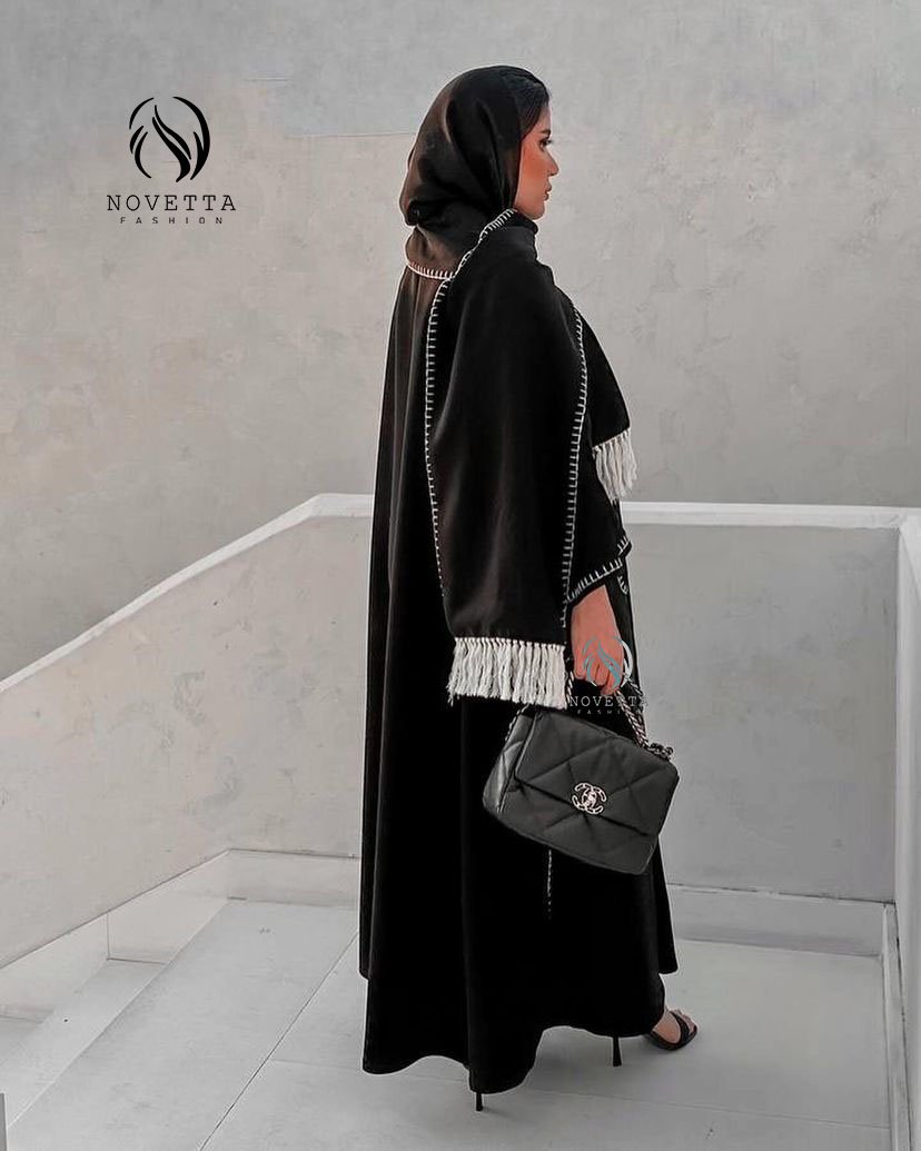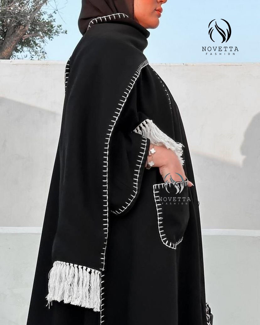 عباية أسود عملية مع شغل ستيتش أبيض بارز وحواف مزينة بشرابات تعطيها لمسة مميزة وأنيقة.بخامة جوخ ليكرا والمقاسات وافية وواسعة