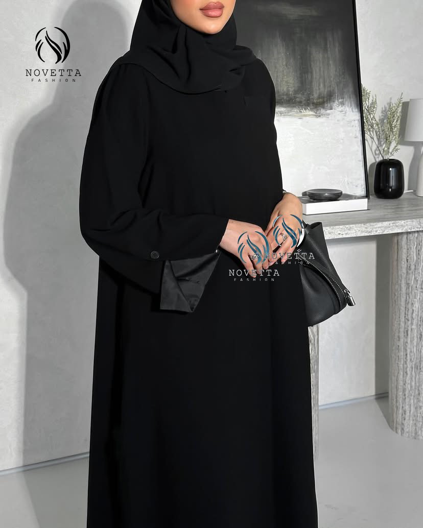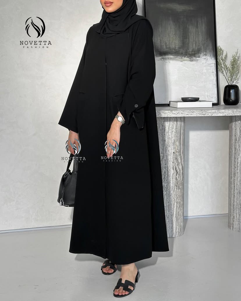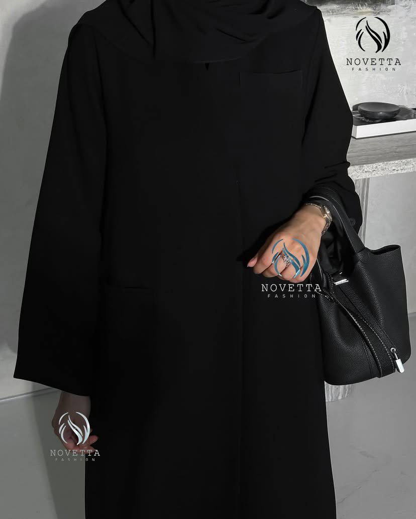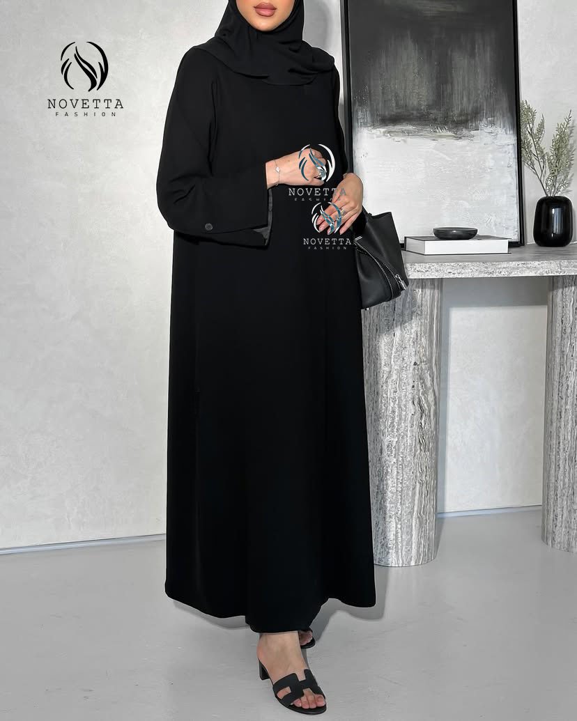 تصميم عملي باللون الأسود الكلاسيكي، قصّة واسعة مريحة مع تفاصيل بسيطة تضيف لمسة أناقة عملية.بخامة فكتوريا كوري شديدة السواد والمقاسات وافية وواسعة
