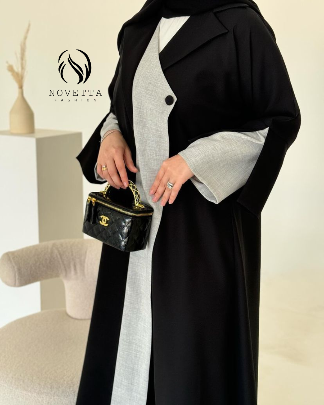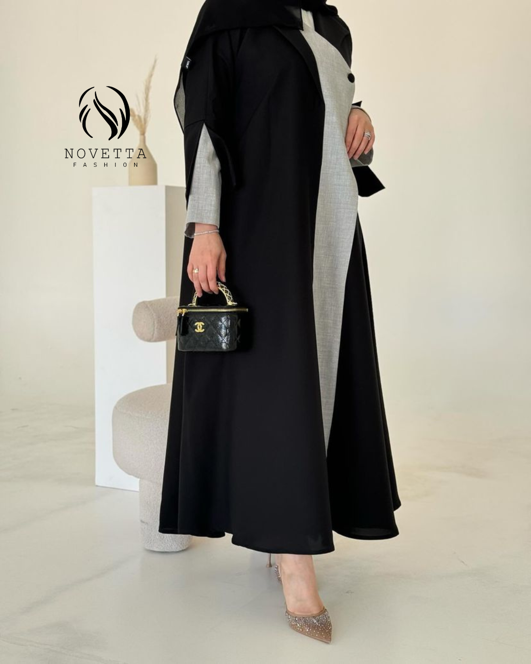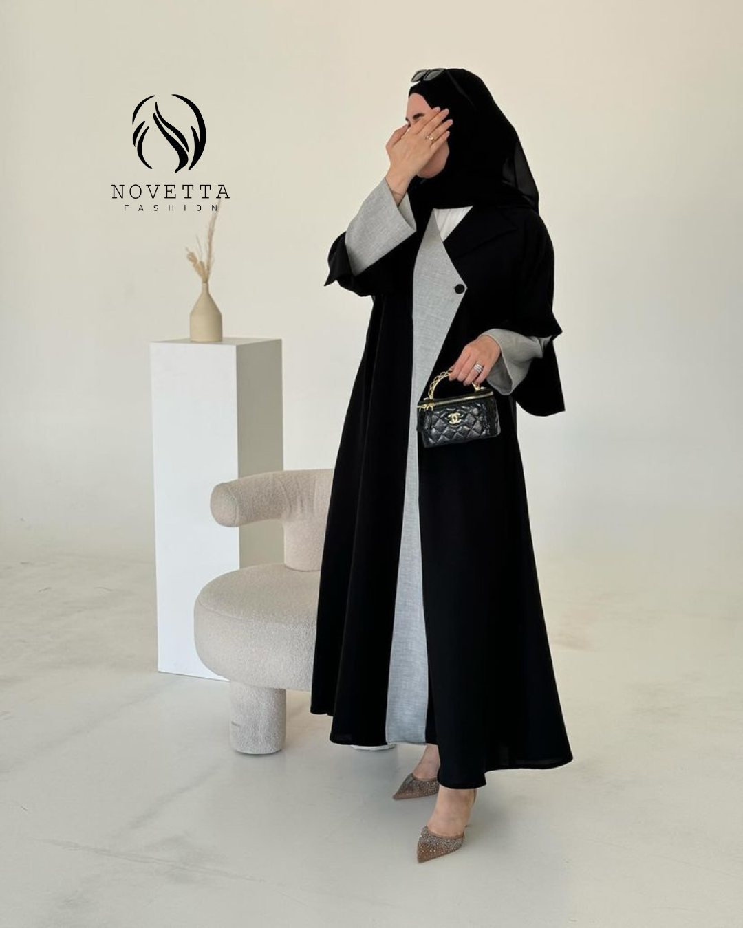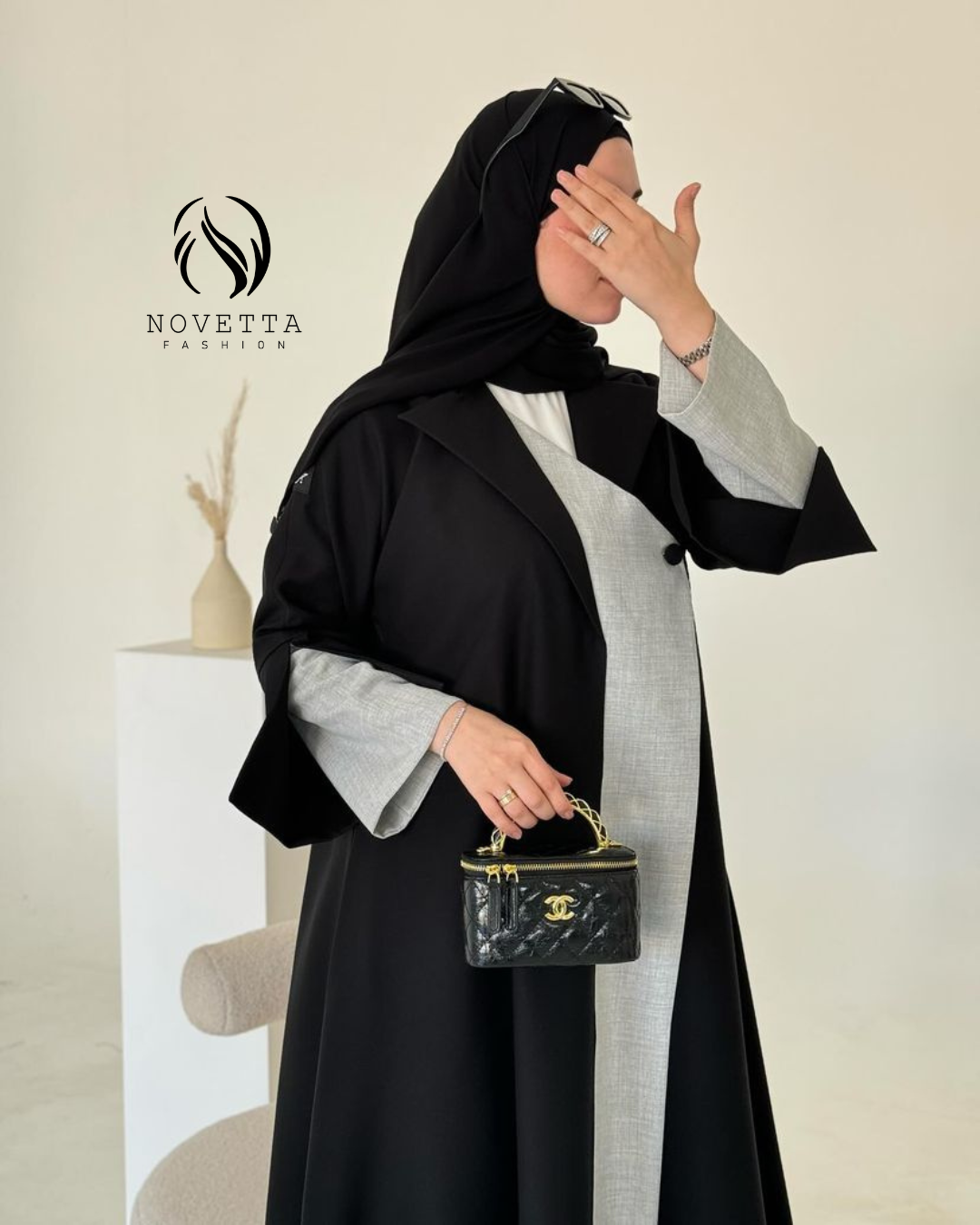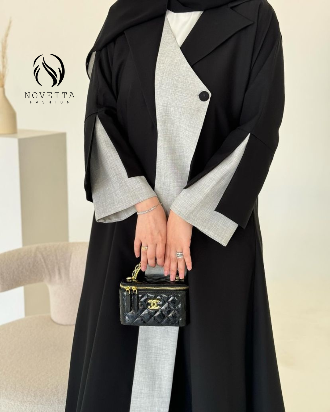 عباية بتصميم عصري، مزيج بين الأسود الفخم والرمادي الهادئ لإطلالة أنيقة عملية تناسب كل الأوقات. قصة واسعة مريحة مع تفاصيل بسيطة وراقية تعطي توازن بين العملية والفخامة..بخامة كريب كوبرا والملنج ,المقاسات وافية وواسعة