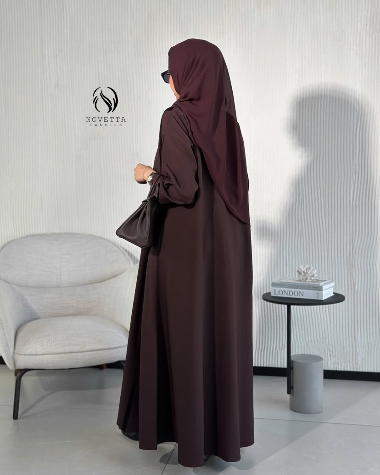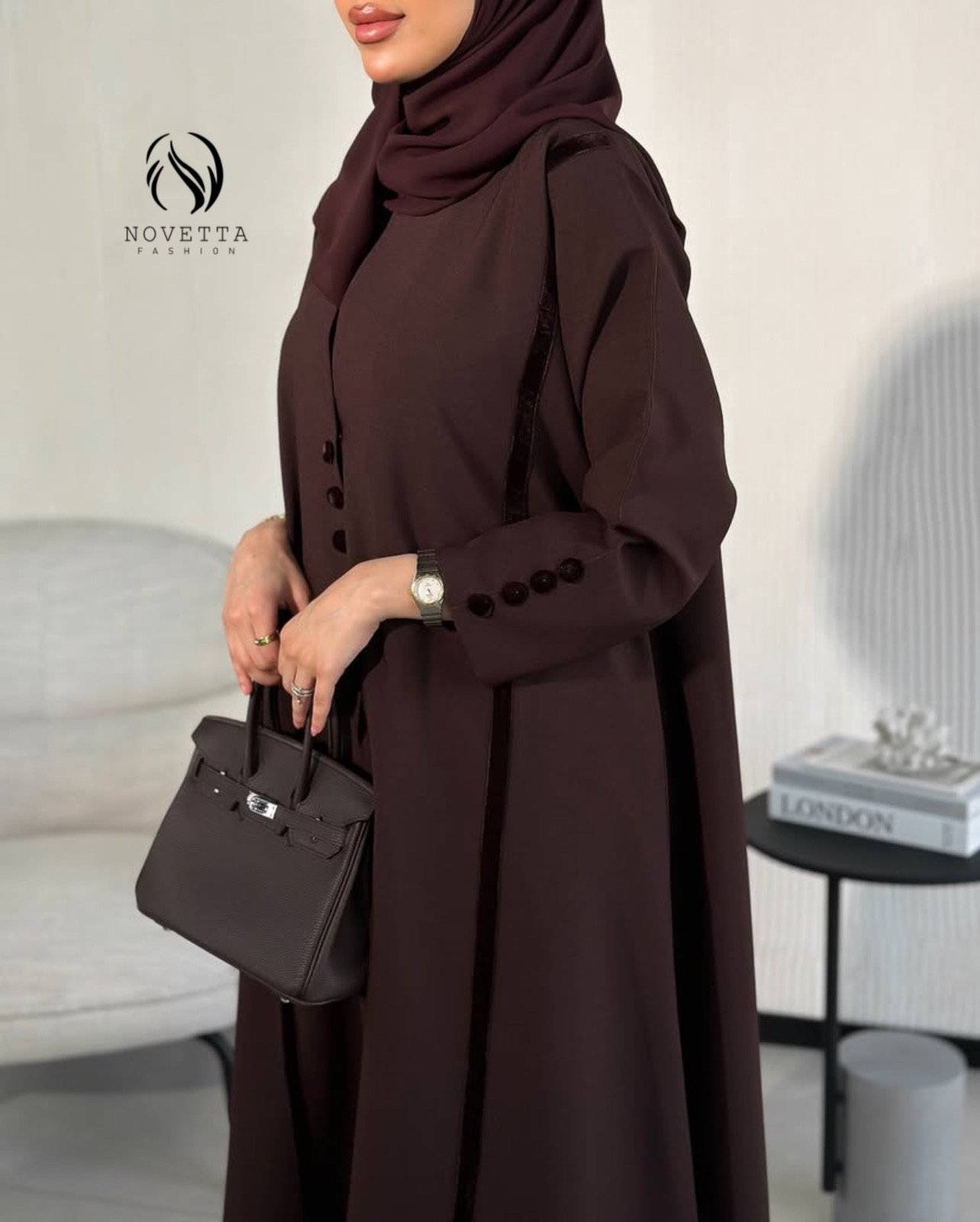 عباية رسمية بلون بني داكن، مصممة بخطوط مخملية ناعمة وأزرار مكسوة تضيف لمسة فخامة هادئة. قصة واسعة وانسيابية مناسبة للعمل والمشاوير الرسمية،بخامة باربي هدلة وناعمة وتقيلة مع مخمل بني والمقاسات وافية واسعة