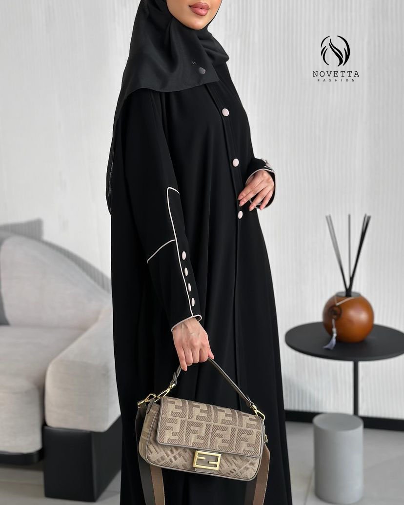 موديل يجسّد الأناقة الهادئة بكل تفاصيلها، عباية سوداء بتصميم انسيابي راقٍ ينسدل بنعومة ليمنحك حضورًا مهيبًا. تزيّنها أزرار بيج أنيقة تضيف تباينًا فاخرًا ولمسة دافئة تعكس الذوق الرفيع.