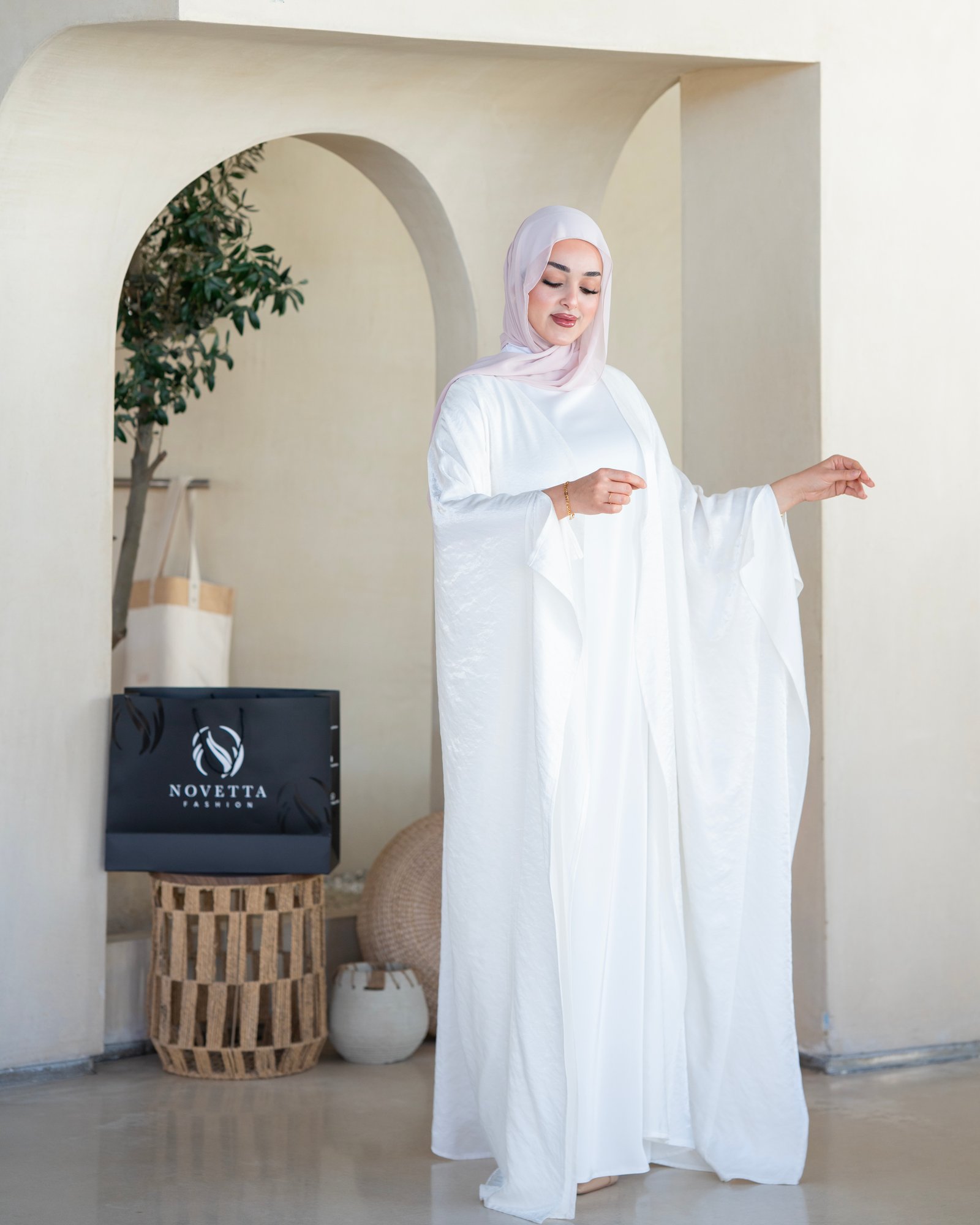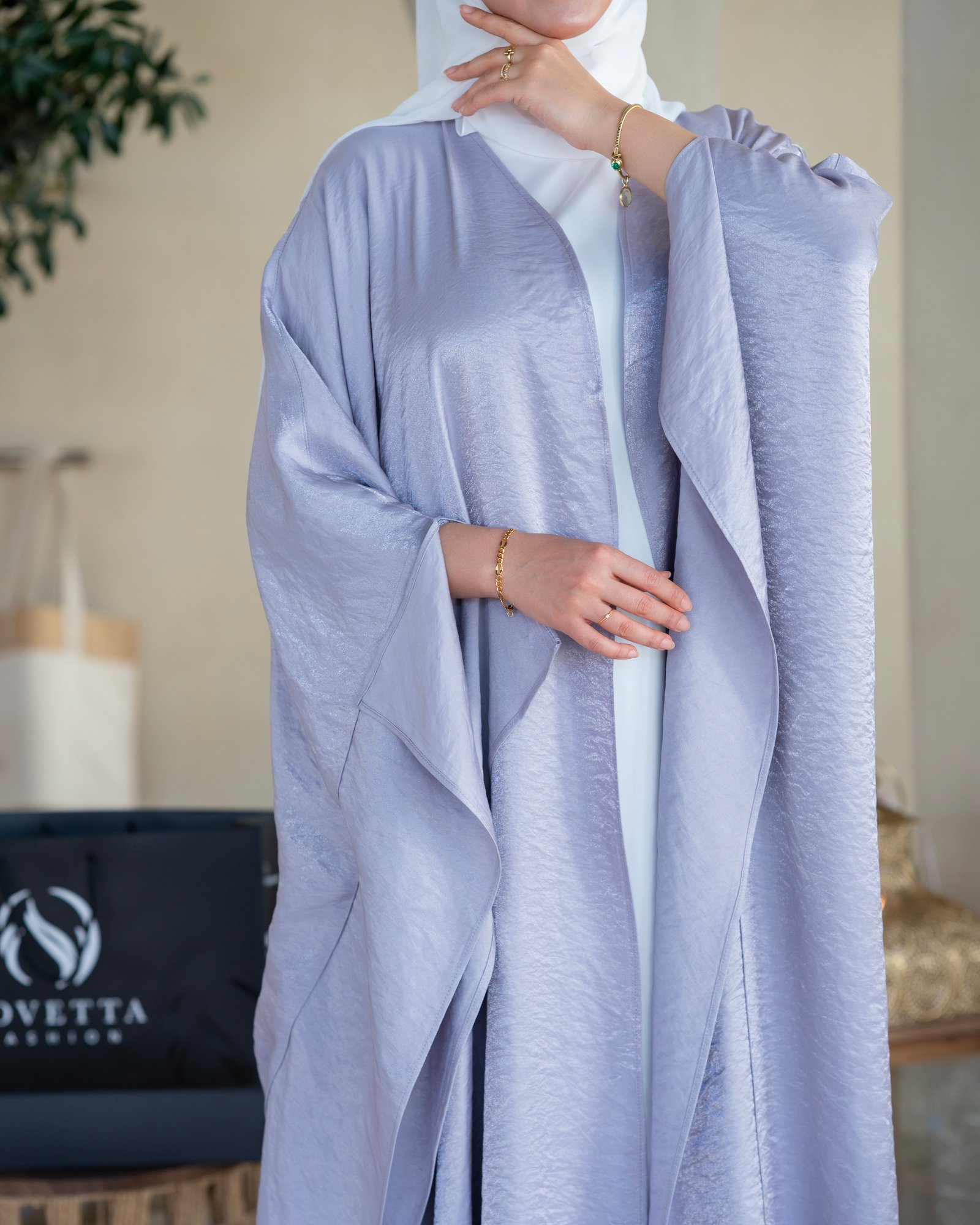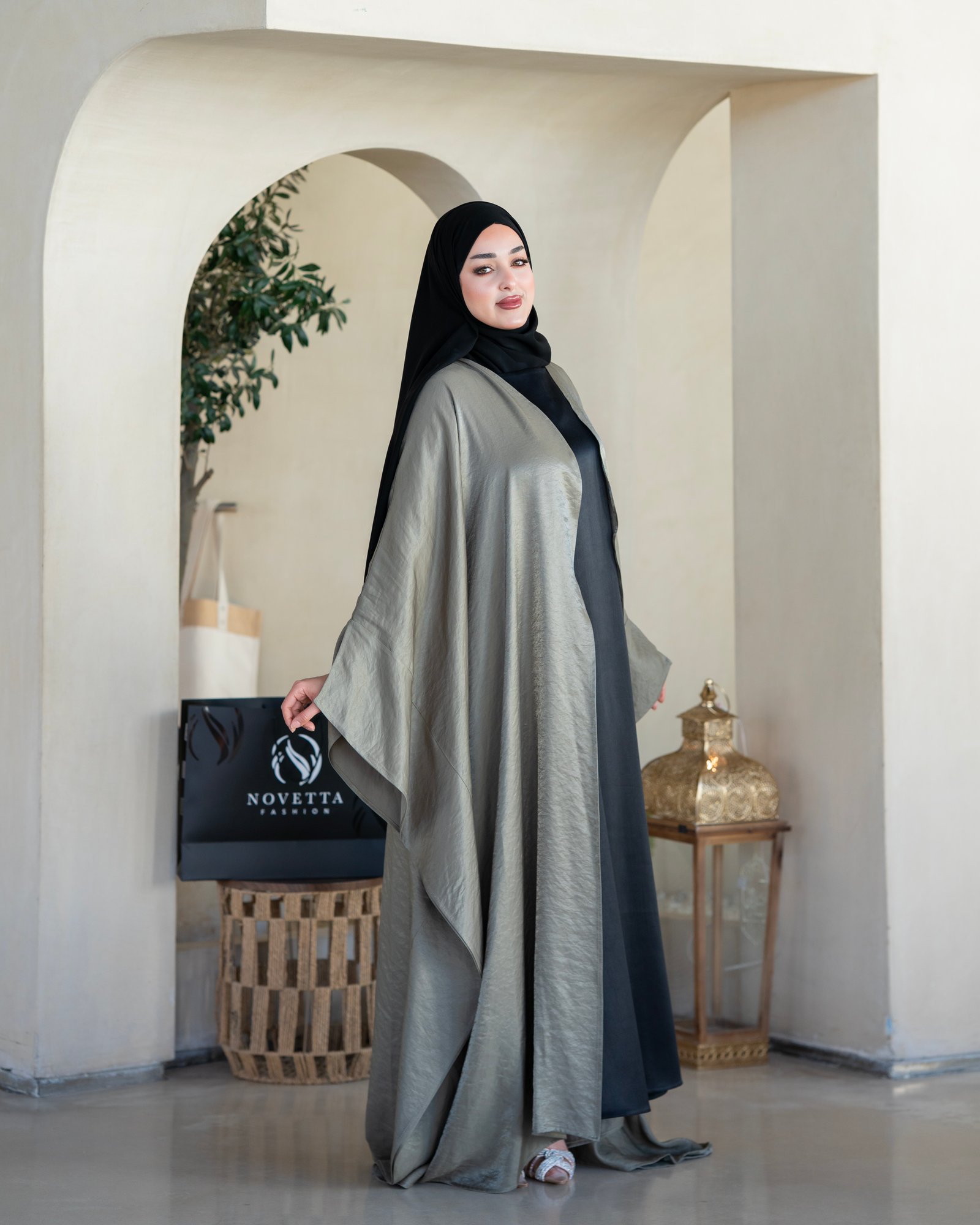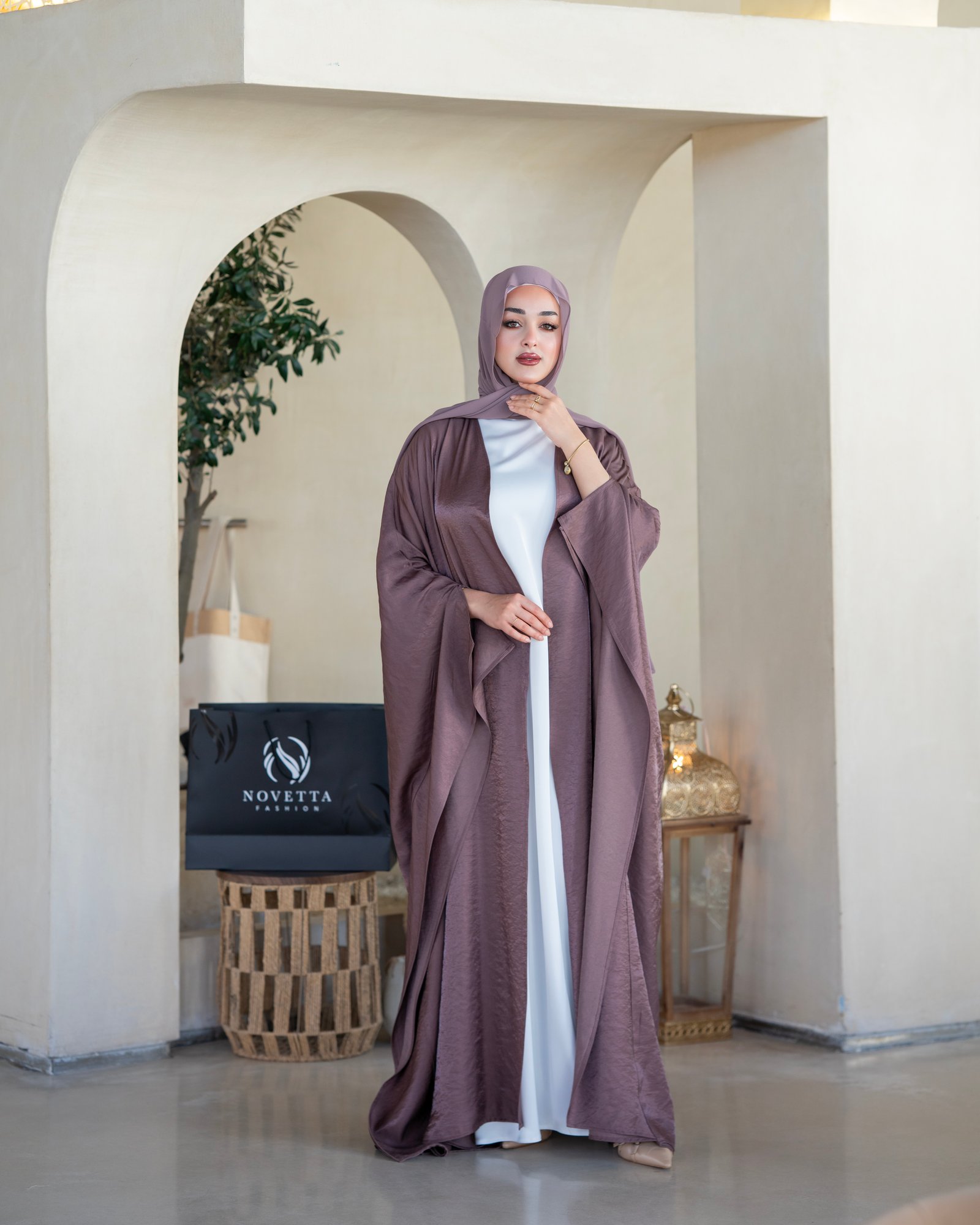 يتميز بقصة واسعة وانسيابية تمنح إطلالة محتشمة وأنيقة، مع خامة ناعمة بلمعة خفيفة تضيف لمسة فاخرة للمظهر.