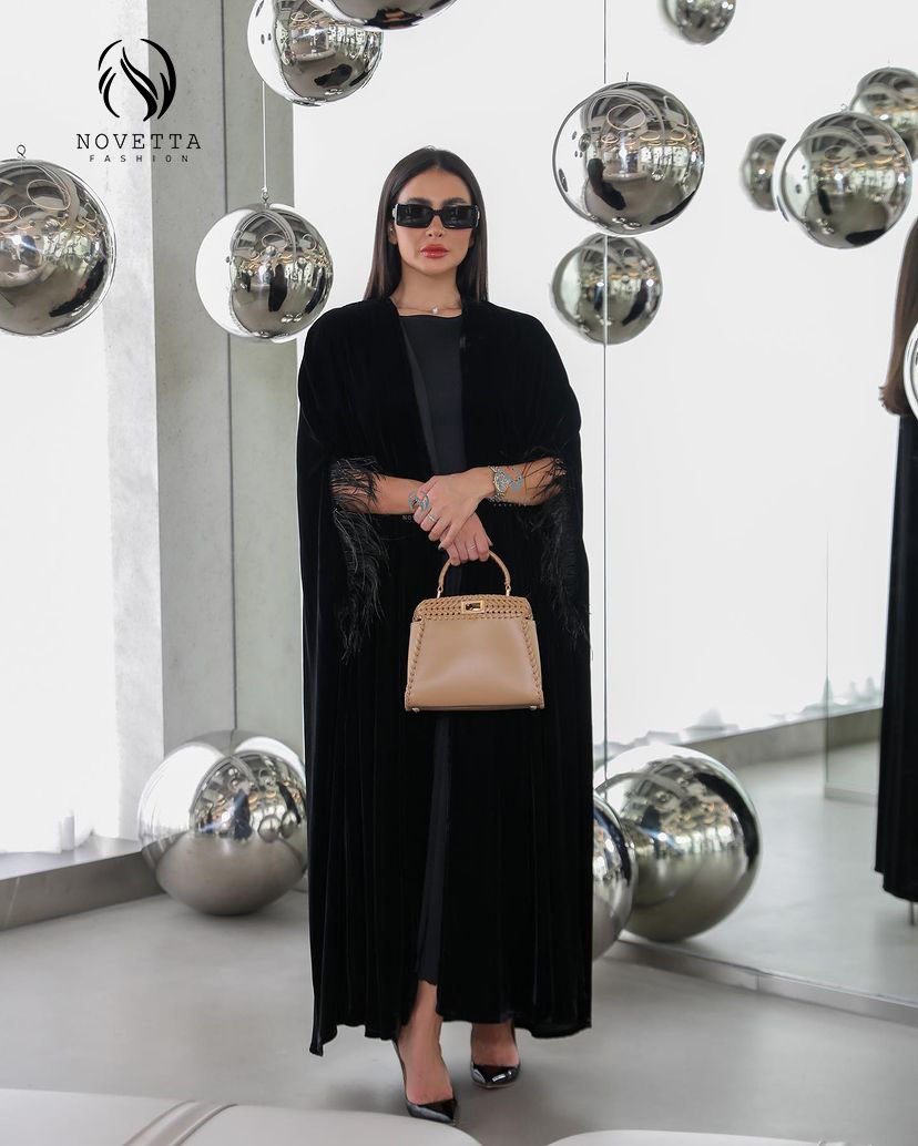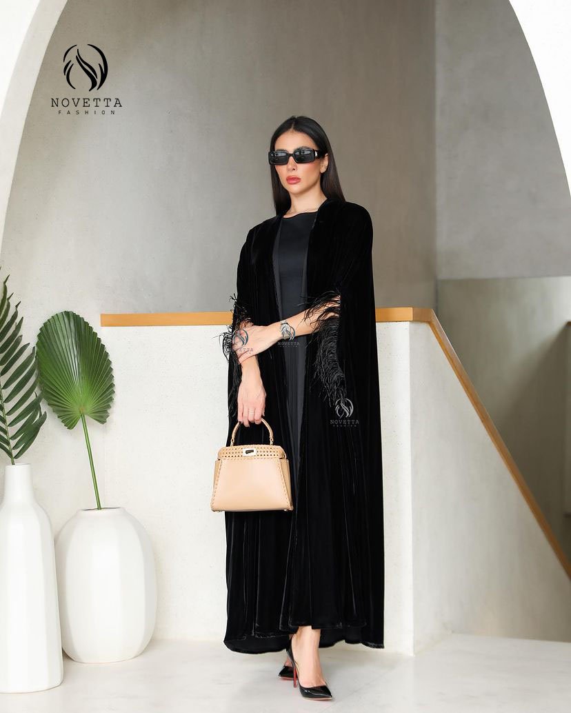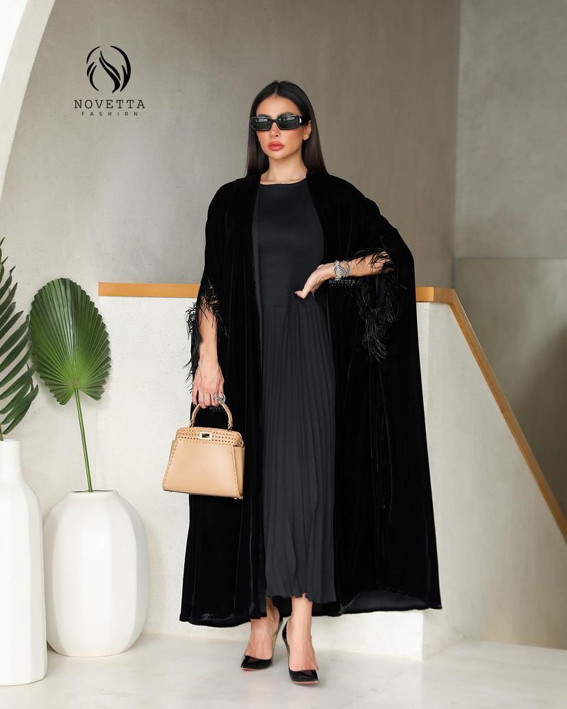 عباية سوداء فاخرة بقصة واسعة وانسيابية، مزينة بلمسات ريش أنيقة تعطيها حضور راقي ومميز، مثالية للمناسبات والإطلالات الفخمة.