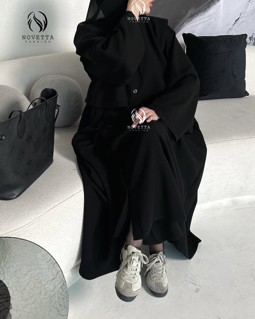 عباية سوداء أنيقة بتفصيل كاب علوي يعكس فخامة التصميم وهدوئه، مصنوعة من خامة ناعمة وعالية الجودة بقصة واسعة وانسيابية.بخامة كريب اندونيسي والمقاسات وافية وواسعة