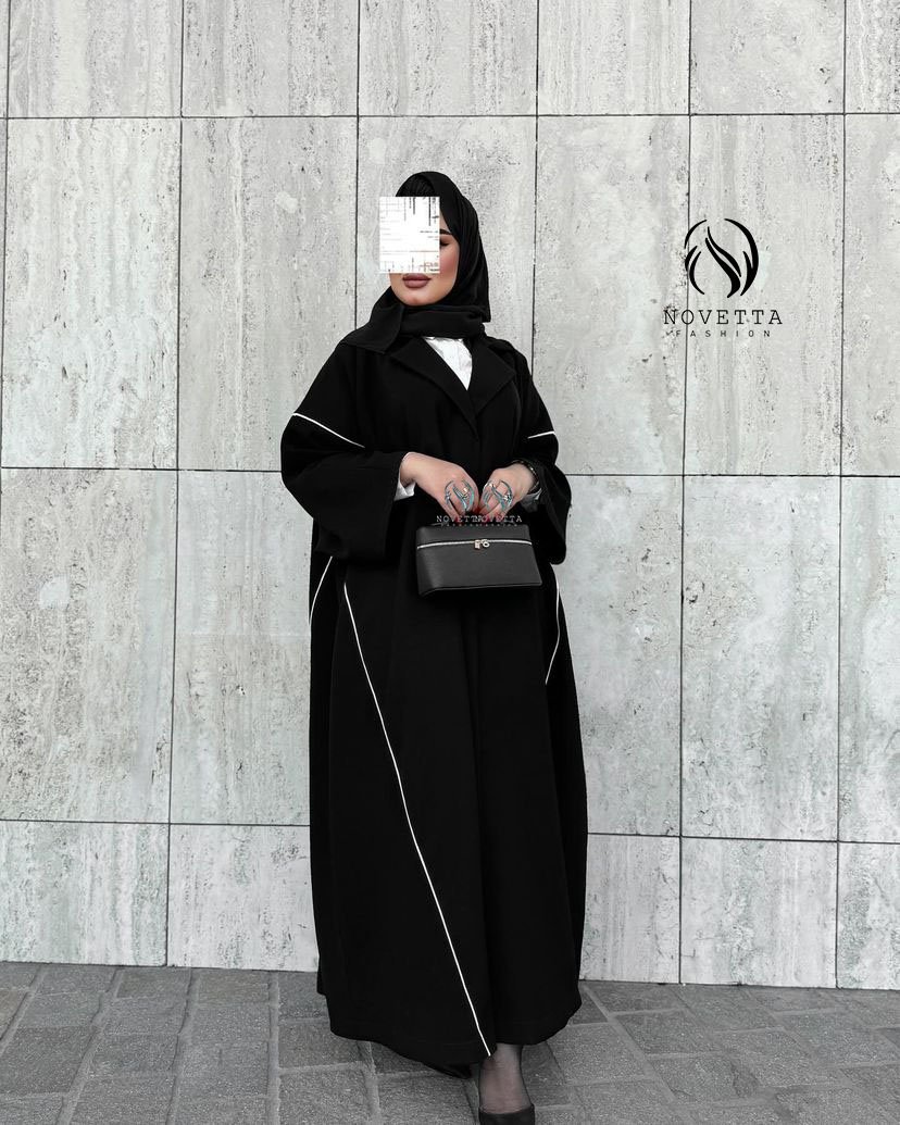 عباية سوداء فاخرة بتفاصيل بيضاء رفيعة تنسدل بانسيابية، تصميم يجمع بين البساطة والرقي بخامة حبر اندونيسي
