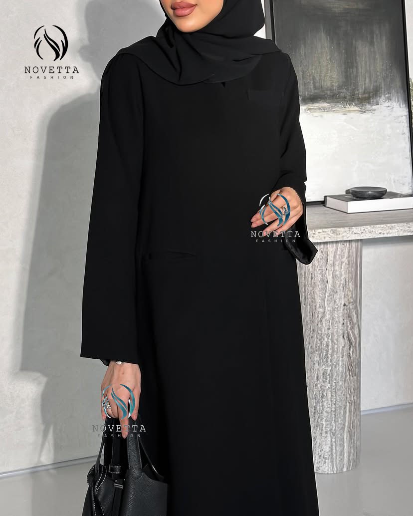 تصميم عملي باللون الأسود الكلاسيكي، قصّة واسعة مريحة مع تفاصيل بسيطة تضيف لمسة أناقة عملية.بخامة فكتوريا كوري شديدة السواد والمقاسات وافية وواسعة